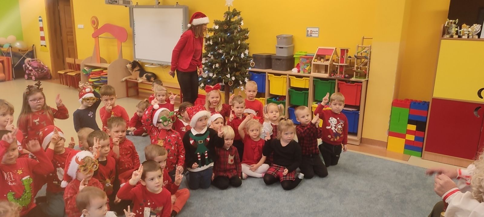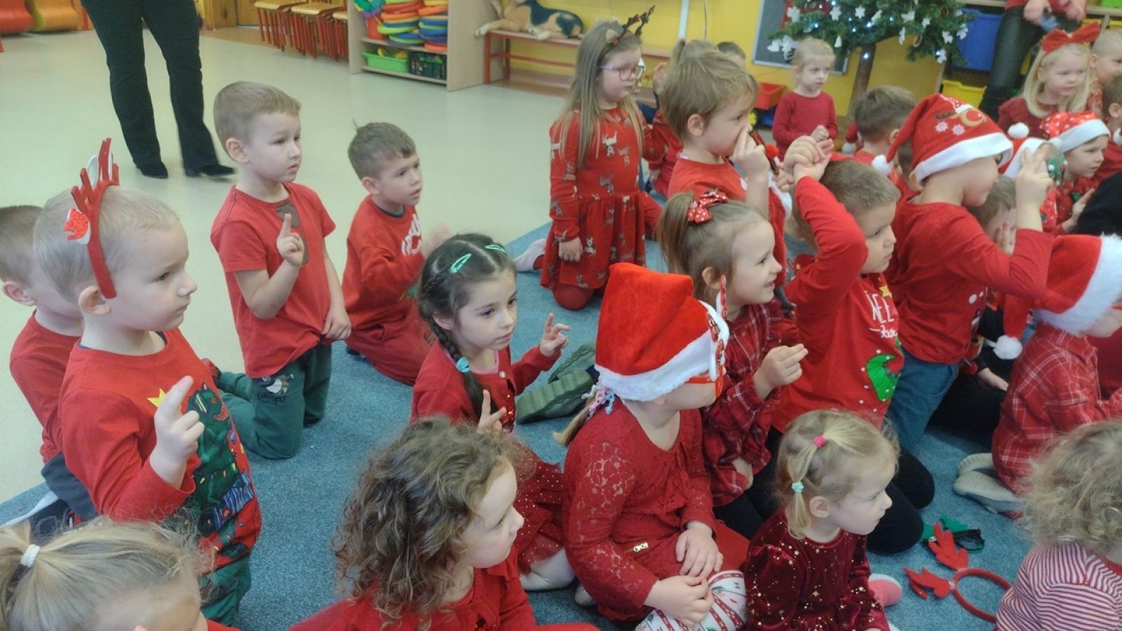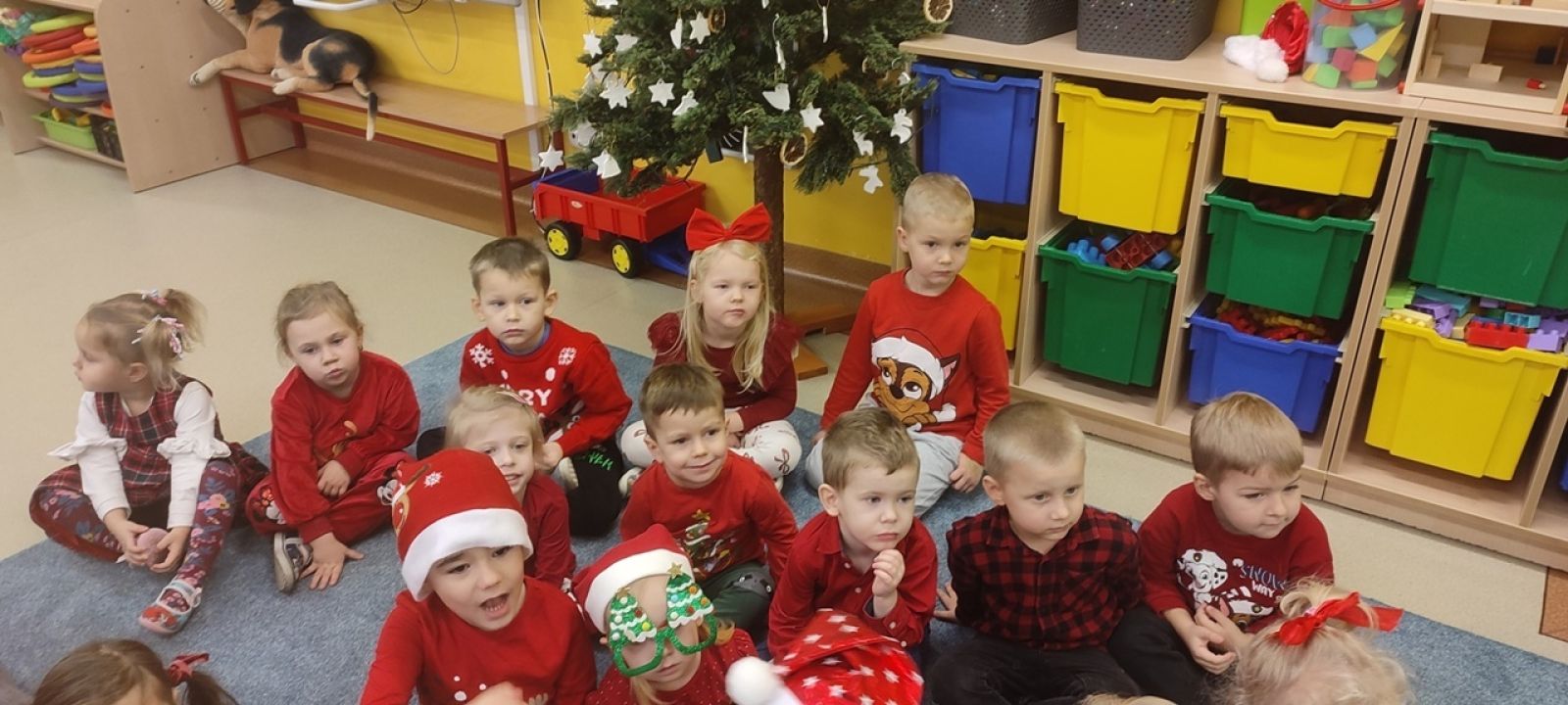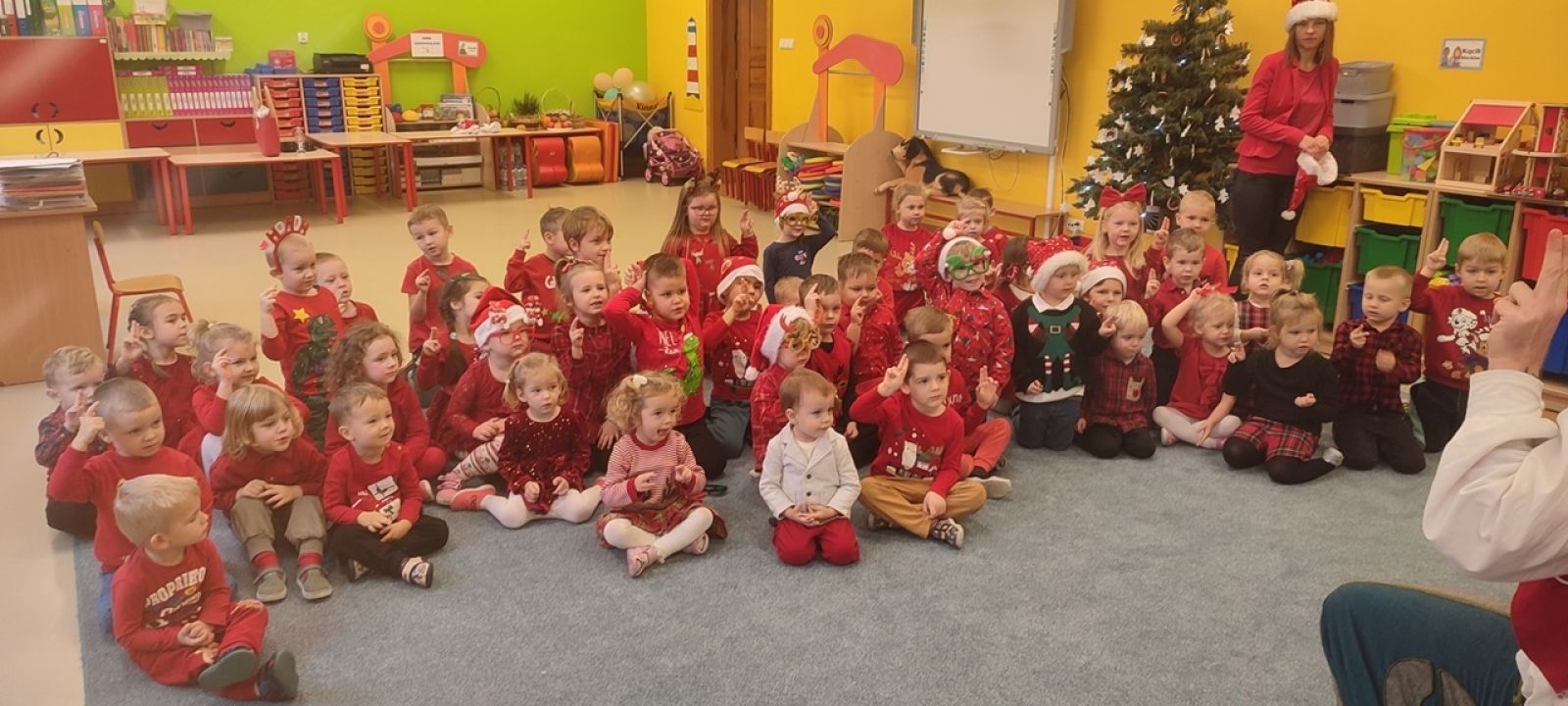 Słowami tej piosenki powitały Świętego Mikołaja i jego wiernego Elfa dzieci z oddziałów Motylki, Jagódki, Pszczółki i Rybki podczas wspólnego spotkania 5.12. Dzieci pełne ekscytacji oczekiwały przyjścia tego najważniejszego, w tym czasie, dla nich gościa a gdy w sali pojawił się Elf, już wiedziały kogo zobaczą tuż za nim. Przedszkolaki cierpliwie czekały, aż każdy z nich otrzyma upominek. A i Mikołaj nie odszedł z pustymi rękami, bo dzieci przygotowały dla niego pamiątkowe laurki. To był pełen emocji dzień. Do zobaczenia za rok Święty Mikołaju!