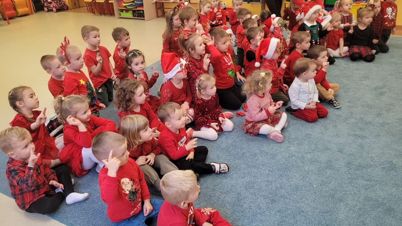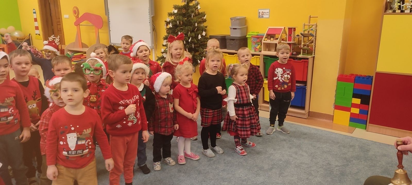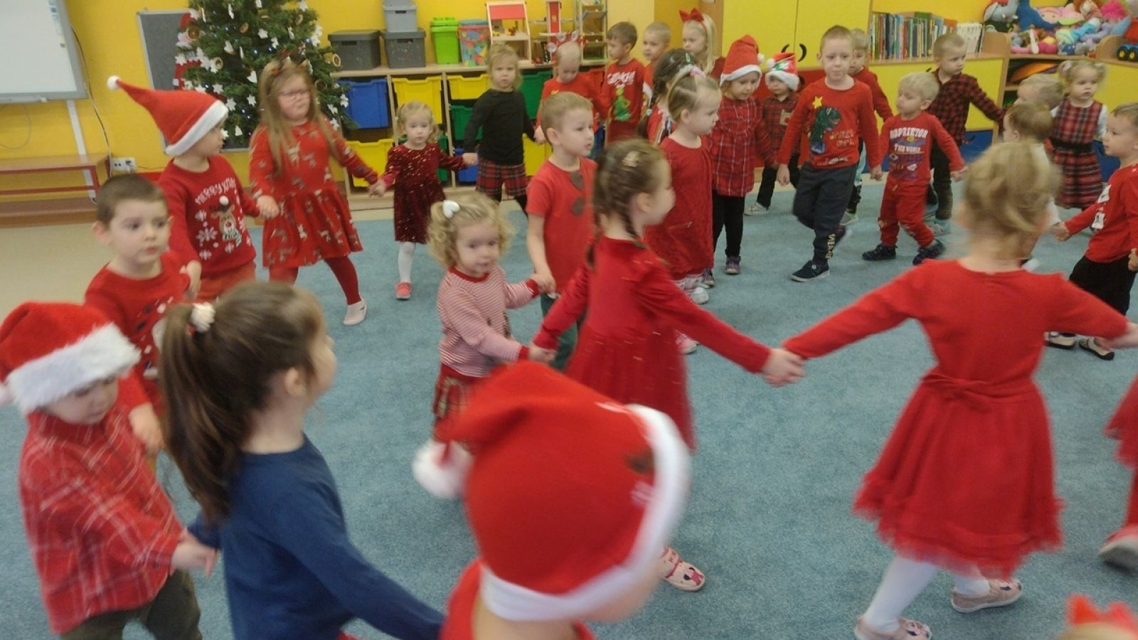 Słowami tej piosenki powitały Świętego Mikołaja i jego wiernego Elfa dzieci z oddziałów Motylki, Jagódki, Pszczółki i Rybki podczas wspólnego spotkania 5.12. Dzieci pełne ekscytacji oczekiwały przyjścia tego najważniejszego, w tym czasie, dla nich gościa a gdy w sali pojawił się Elf, już wiedziały kogo zobaczą tuż za nim. Przedszkolaki cierpliwie czekały, aż każdy z nich otrzyma upominek. A i Mikołaj nie odszedł z pustymi rękami, bo dzieci przygotowały dla niego pamiątkowe laurki. To był pełen emocji dzień. Do zobaczenia za rok Święty Mikołaju!