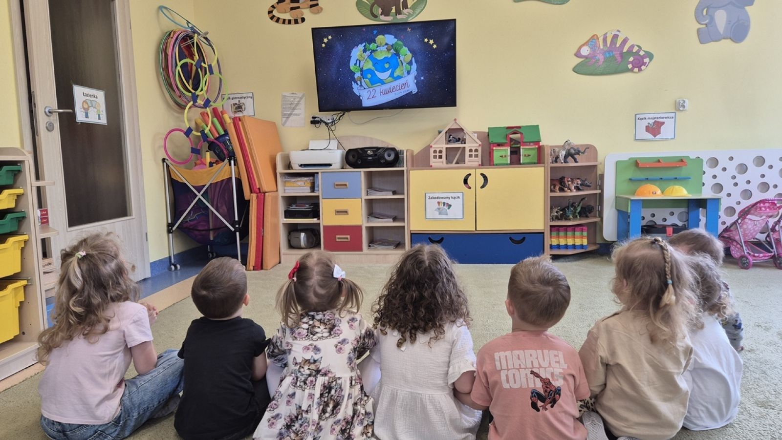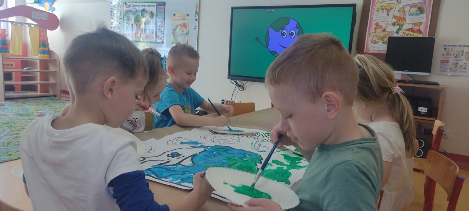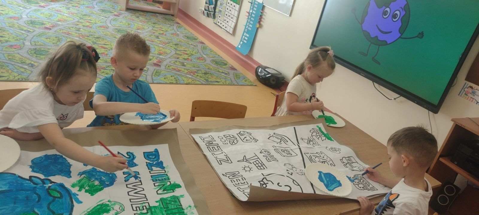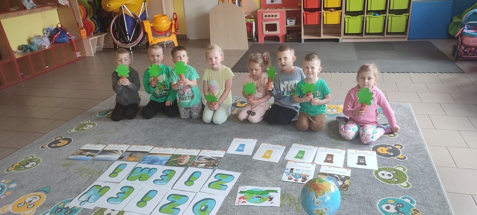 22 kwietnia nasze przedszkole wypełniła zielona energia i wyjątkowy klimat – obchodziliśmy Dzień Ziemi. To święto było doskonałą okazją do rozmów o ochronie środowiska oraz do nauki przez zabawę. Grupy Rybki, Motylki, Pszczółki i Jagódki z wielkim entuzjazmem zaangażowały się w szereg ekologicznych działań. Dzieci malowały plakaty ekologiczne oraz podczas zajęć utrwalały wiedzę na temat segregacji odpadów. Przedszkolaki z pomocą Pań przypomniały sobie, co powinno trafić do którego pojemnika i dlaczego recykling jest tak ważny. Zabawa w sortowanie śmieci była nie tylko edukacyjna, ale i bardzo angażująca – maluchy świetnie poradziły sobie z zadaniami. W każdej z grup dzieci obejrzały prezentacje multimedialne oraz bajki edukacyjne o tematyce ekologicznej. Materiały w przystępny sposób przybliżyły najmłodszym, jak dbać o lasy, rzeki, powietrze i zwierzęta. Dzięki ciekawym obrazkom i opowieściom dzieci lepiej zrozumiały, jakie znaczenie mają codzienne, nawet najmniejsze działania w trosce o naszą planetę. Dzień Ziemi w naszym przedszkolu był pełen radości, kolorów i wartościowych treści. Dzieci nie tylko świetnie się bawiły, ale też nauczyły się, że każdy z nas – bez względu na wiek – może być przyjacielem Ziemi.