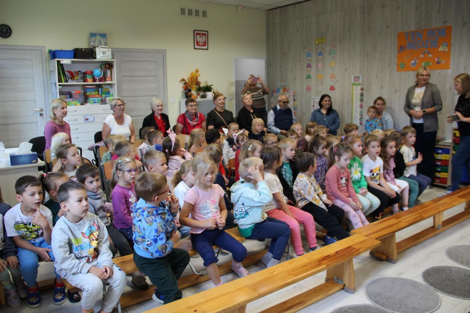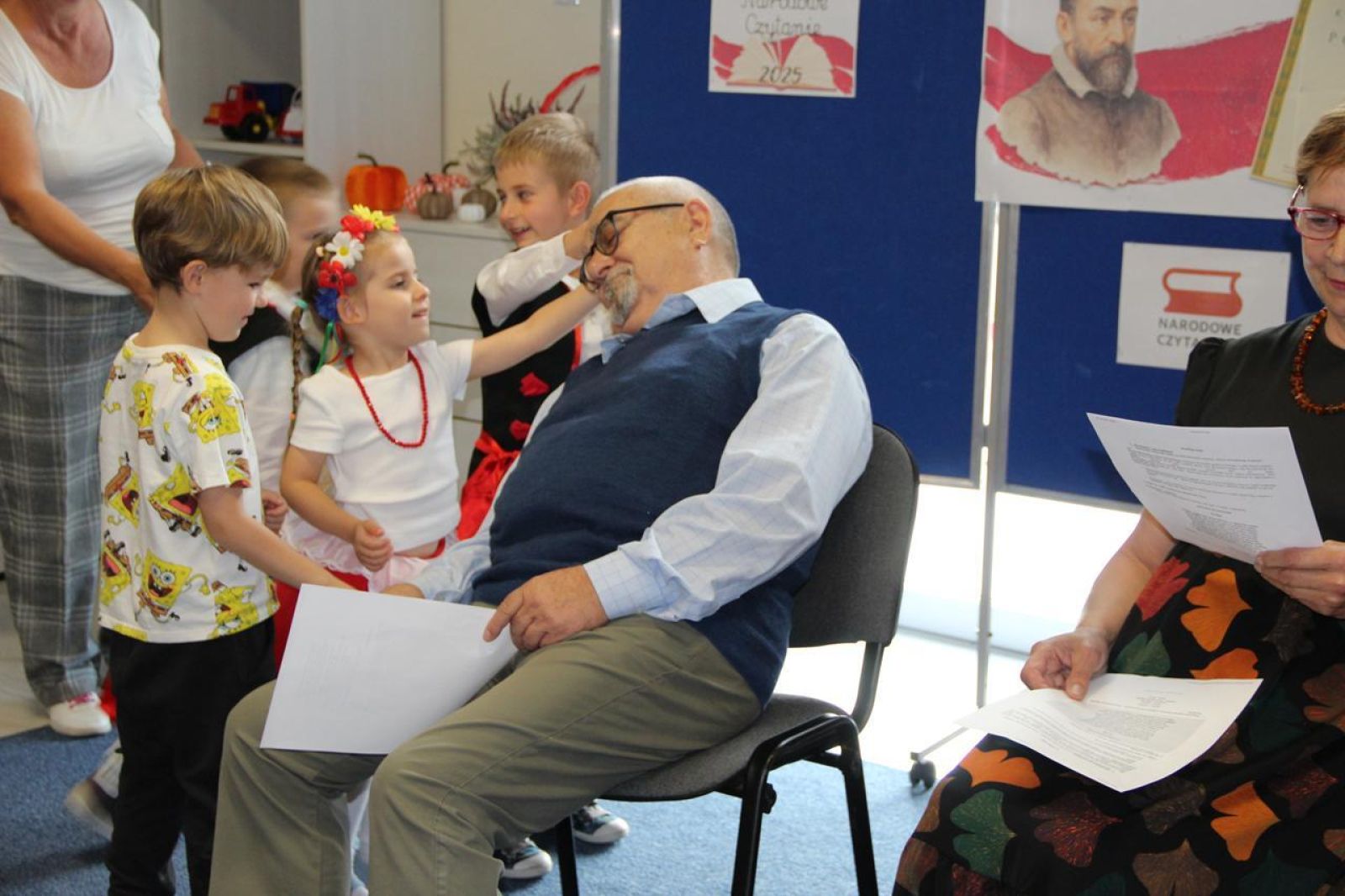 To już kolejny rok, kiedy nasze przedszkole wzięło udział w akcji Narodowe Czytanie. Co roku podczas tej akcji czytane są dzieła, które tworzą kanon polskiej literatury. To już 14 edycja tego przedsięwzięcia. Akcji przewodniczy Prezydent RP Karol Nawrocki wraz z małżonką Martą Nawrocką. W tym roku w Dniu Głośnego Czytania, tj. 29 września zawitali do nas Seniorzy ze Świerczynek i to właśnie Oni zaprezentowali dzieciom fraszkę Jana Kochanowskiego „Na lipę”. Seniorzy w znakomity sposób przedstawili dzieciom tą jakże trudną literaturę, przekazana treść trafiła do dzieci i z chęcią włączyły się w opowieść ruchową, jaką zaproponowali nasi goście. Dzieci z grupy Krasnale i Stokrotki w podziękowaniu dla naszych Seniorów zaśpiewały piosenkę oraz wykonały piękny taniec do utworu „Lipka” oraz wręczyły własnoręcznie wykonane zakładki do książek.