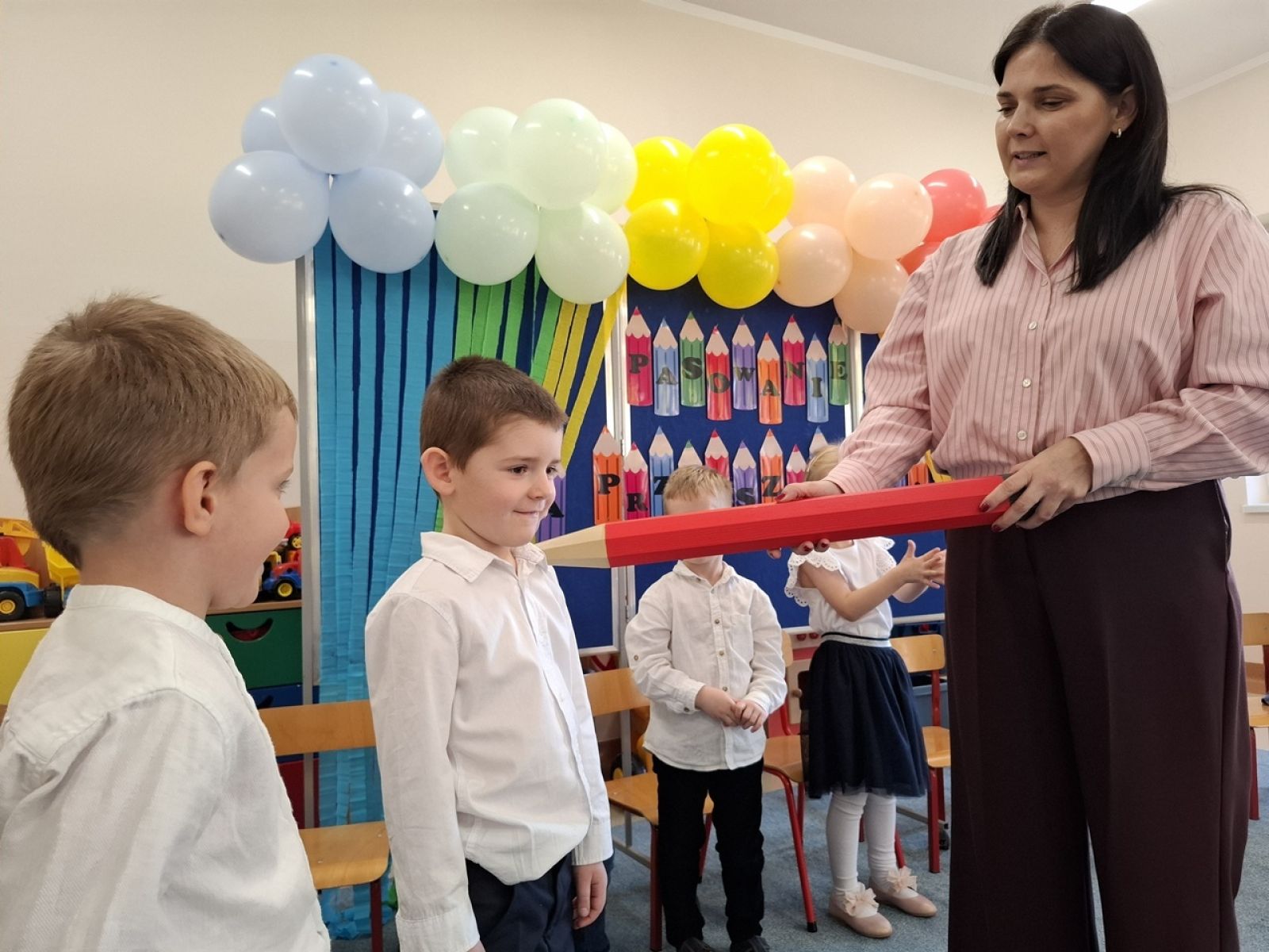 Po części artystycznej nastąpiło uroczyste złożenie przedszkolnej przysięgi i pasowanie każdego dziecka na przedszkolaka przez dyrektora przedszkola Joannę Wojtulską poprzez dotknięcie ramienia dziecka magicznym ołówkiem poprzedzone rymowanym wierszykiem wypowiedzianym przez dyrektora.