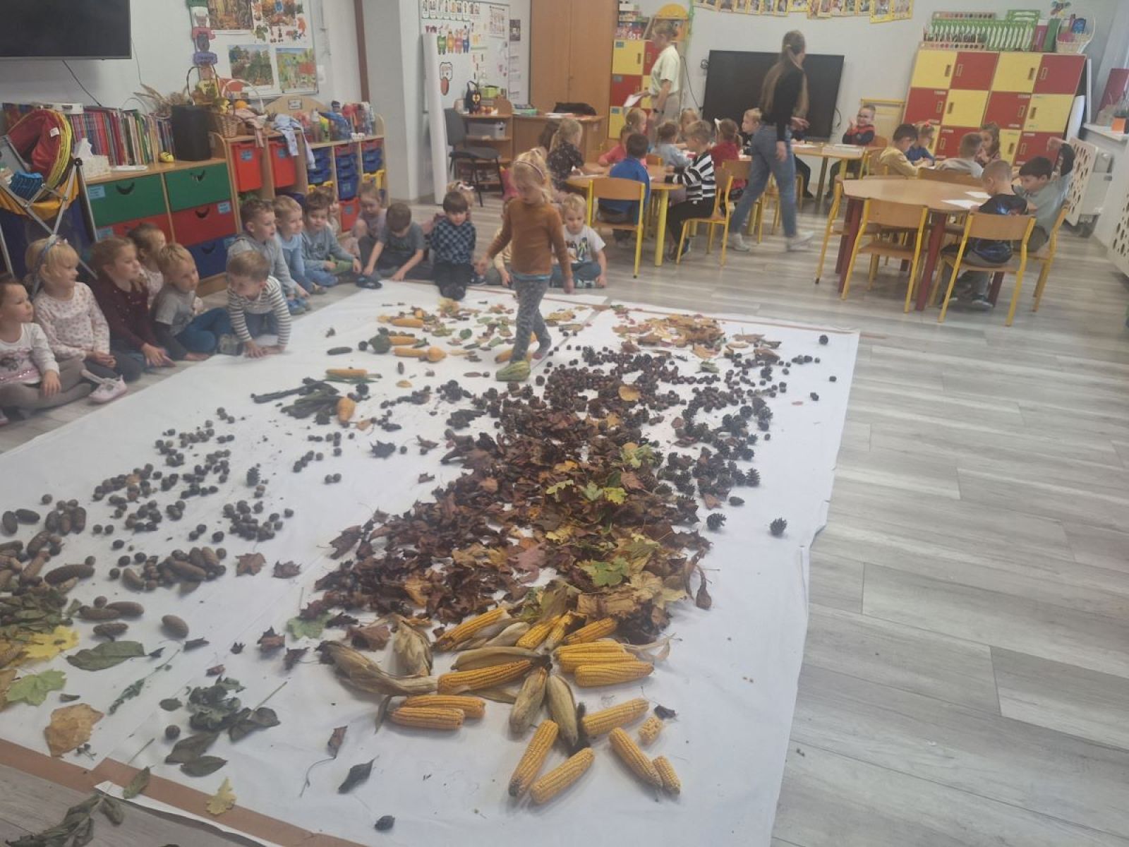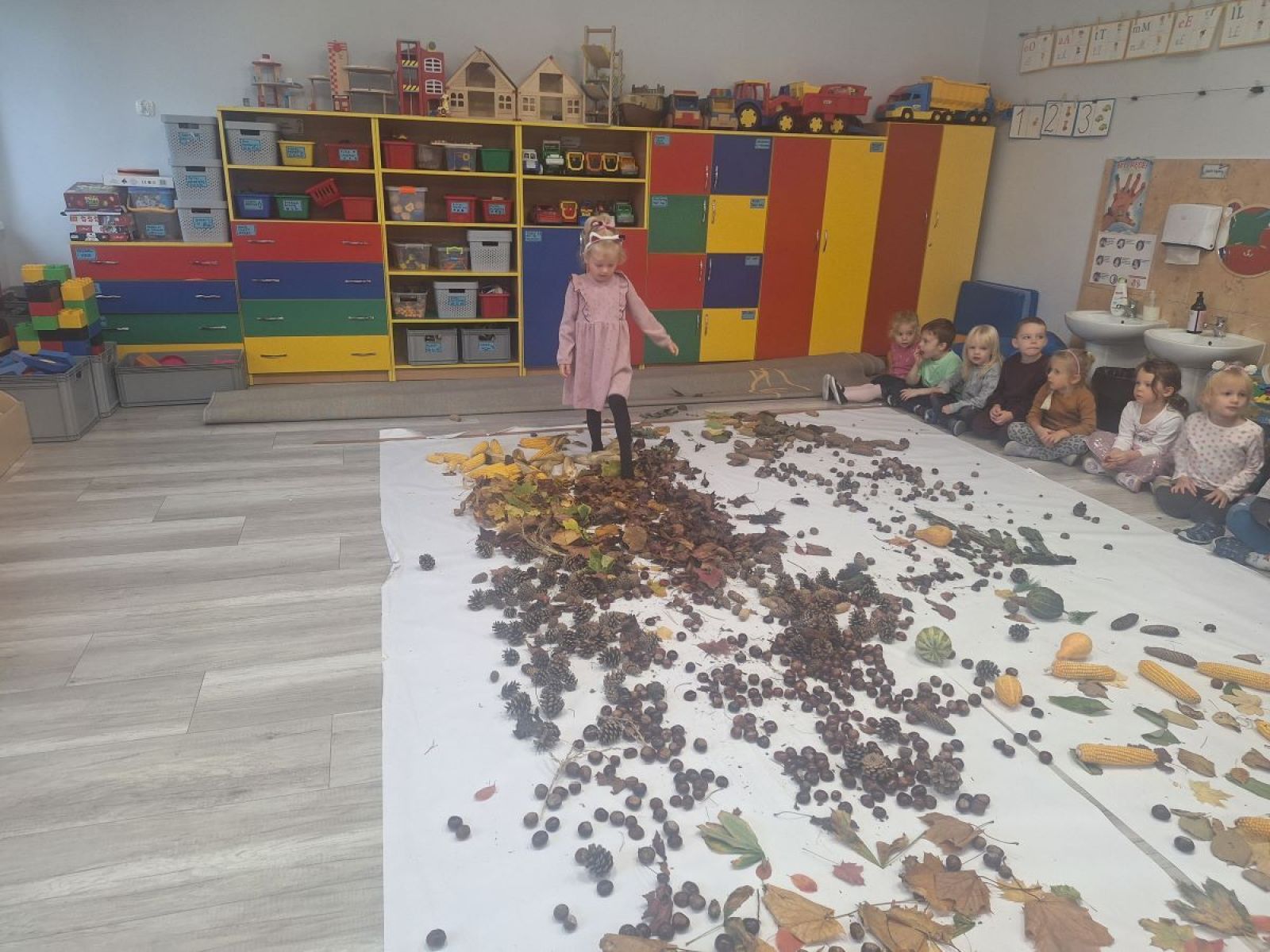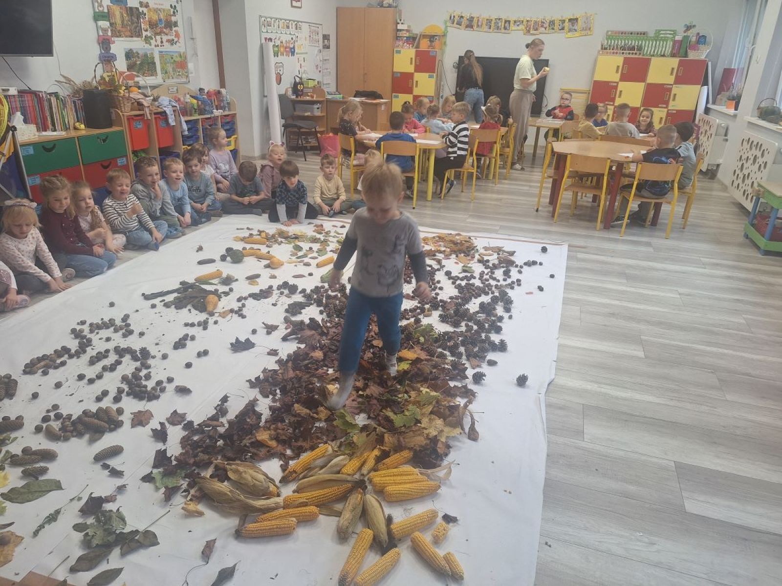 • dzieci podczas zajęć sensorycznych, badają dary jesieni