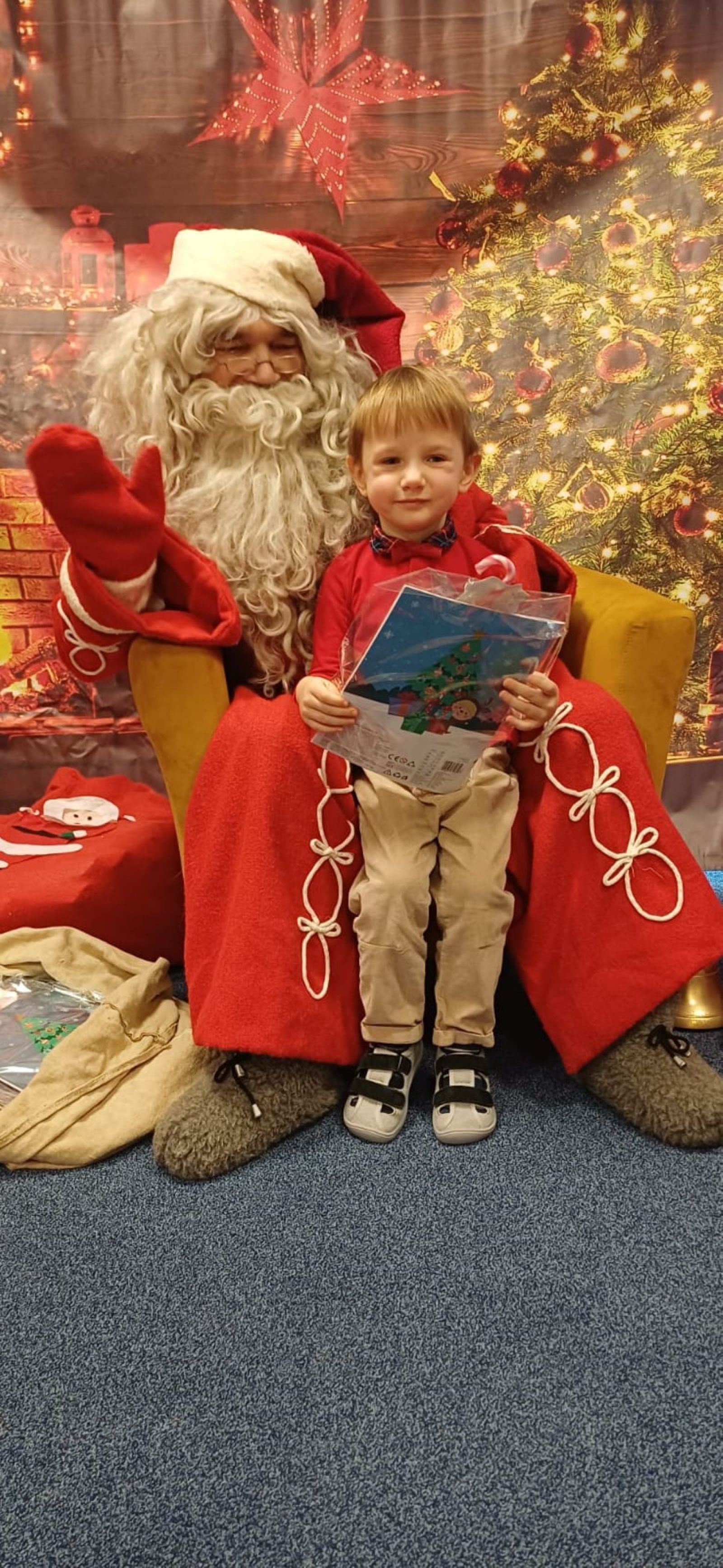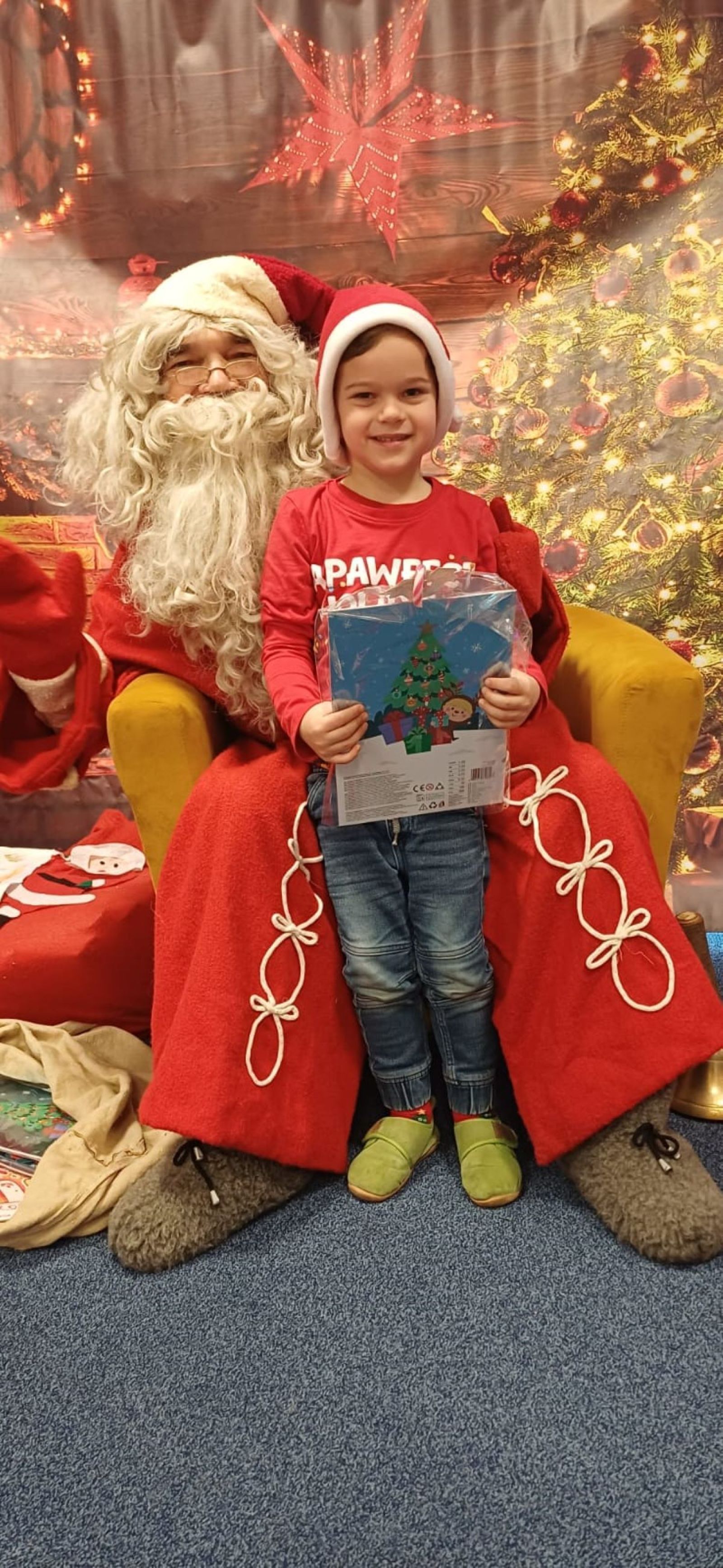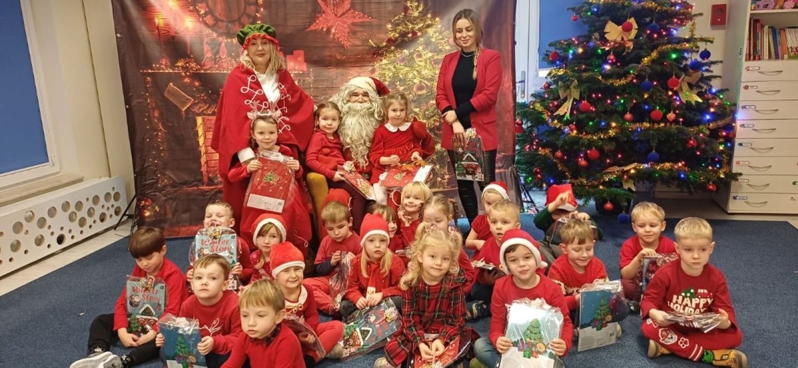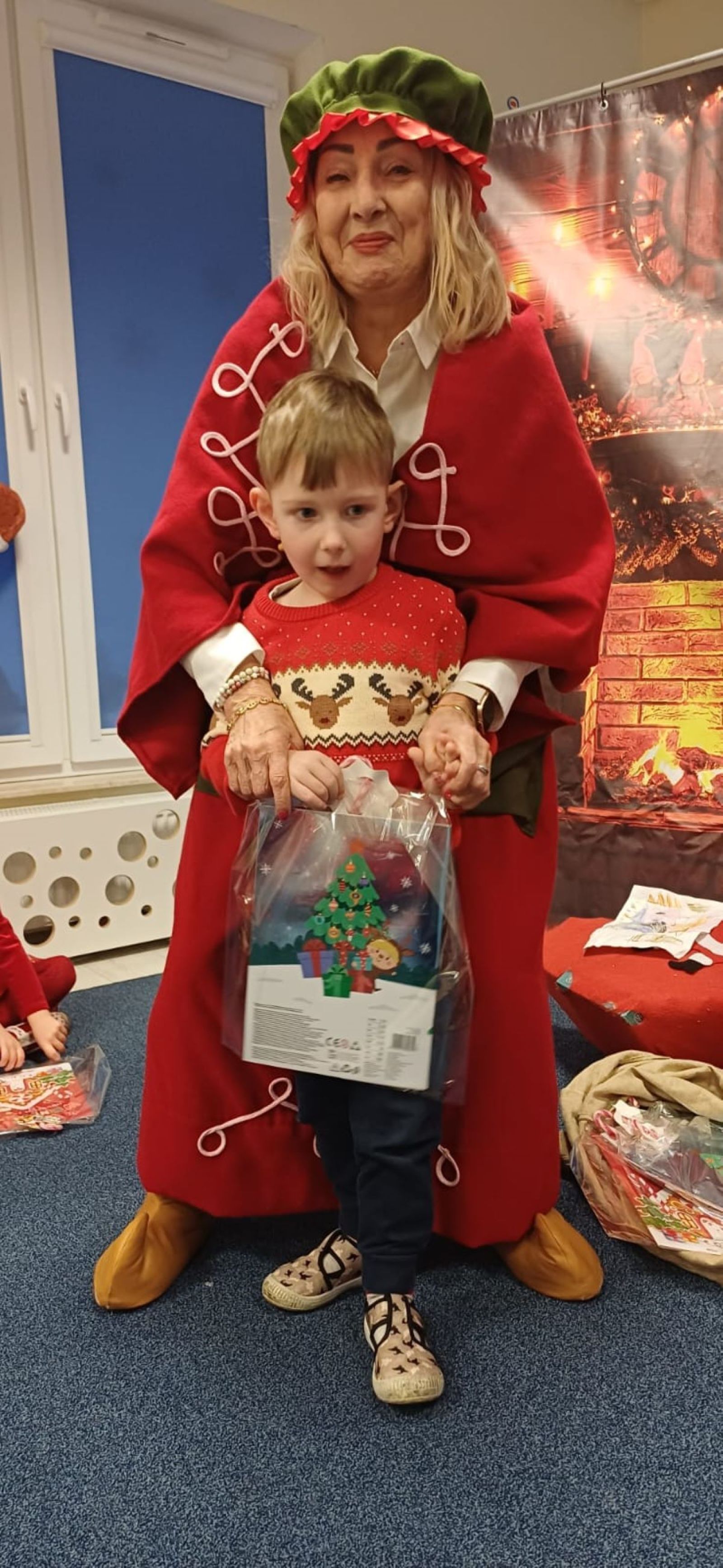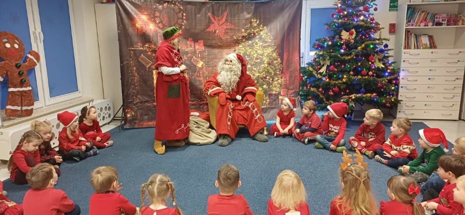• dzieci podczas spotkania ze Świętym Mikołajem i Panią Mikołajową, otrzymują prezenty i śpiewają piosenki