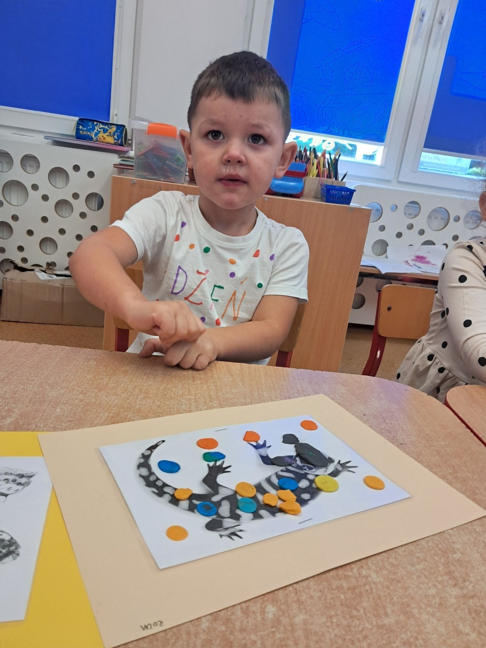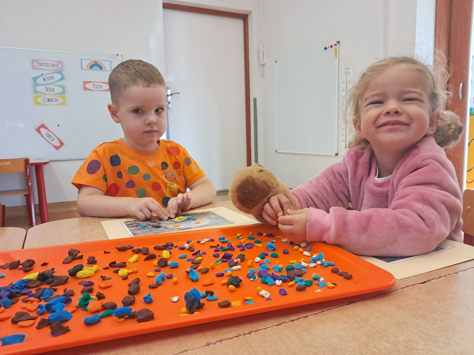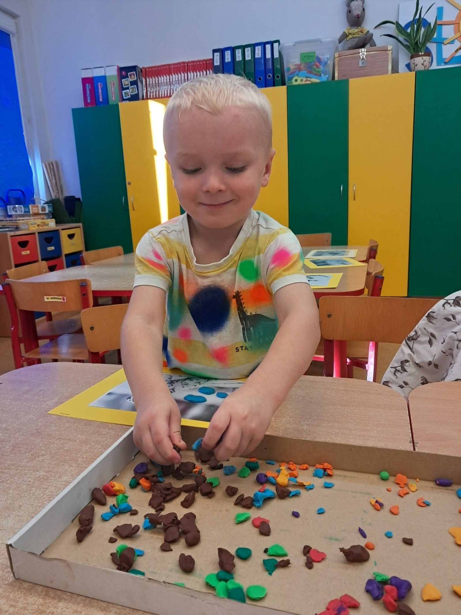 Już od rana dzieci przyszły ubrane w piękne, kolorowe stroje w kropki, co od razu wprowadziło wszystkich w radosny nastrój. Podczas zajęć bawiliśmy się w wyszukiwanie kropek w sali, liczenie ich oraz porównywanie wielkości i kolorów. Nie zabrakło także twórczej pracy plastycznej – każdy przedszkolak wykonał własne, niepowtarzalne dzieło inspirowane kropką. Był to dzień pełen radości, kreatywności i wspólnej zabawy.
