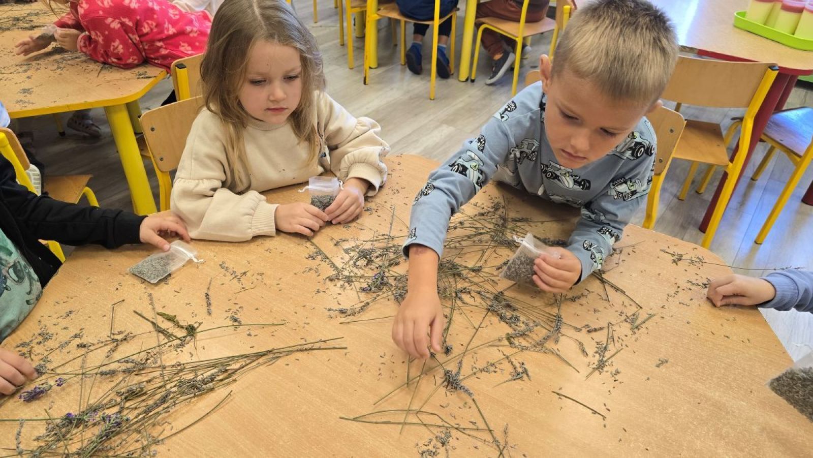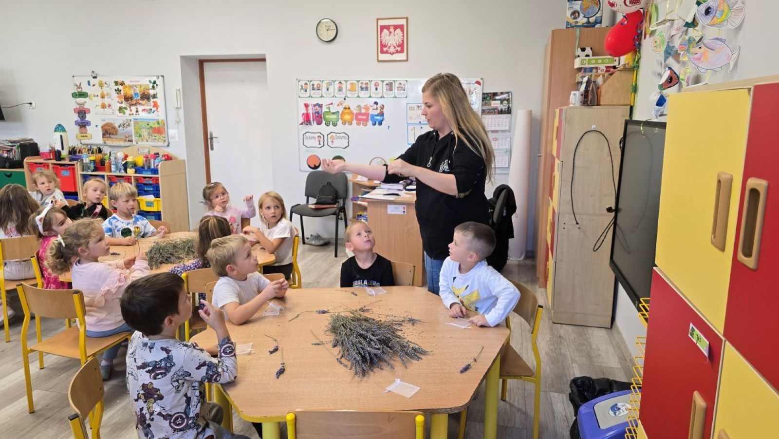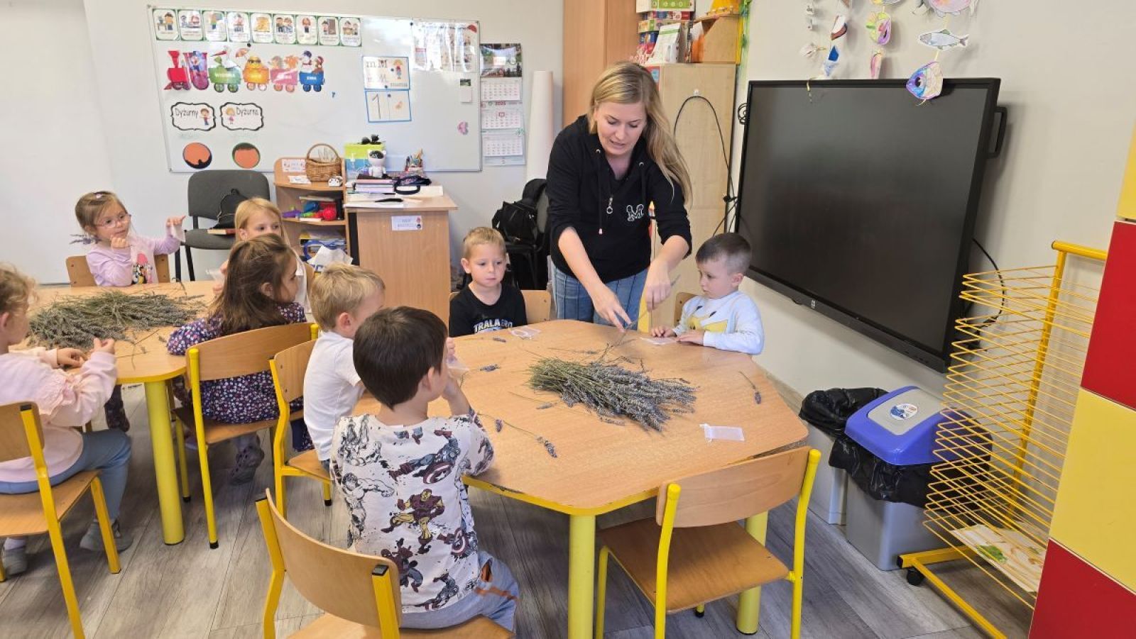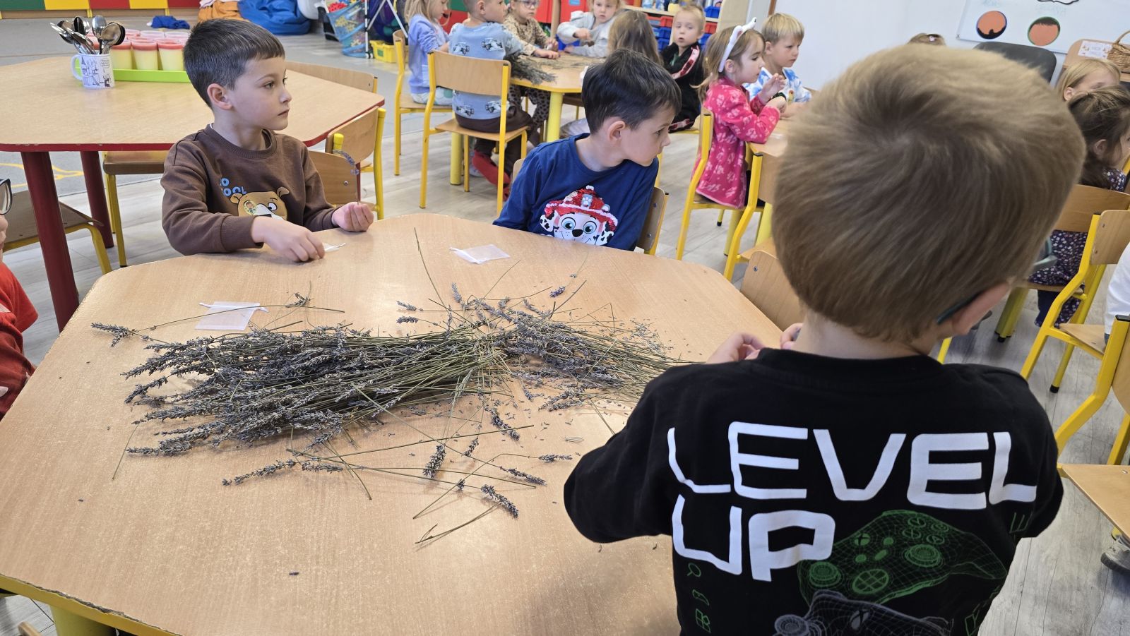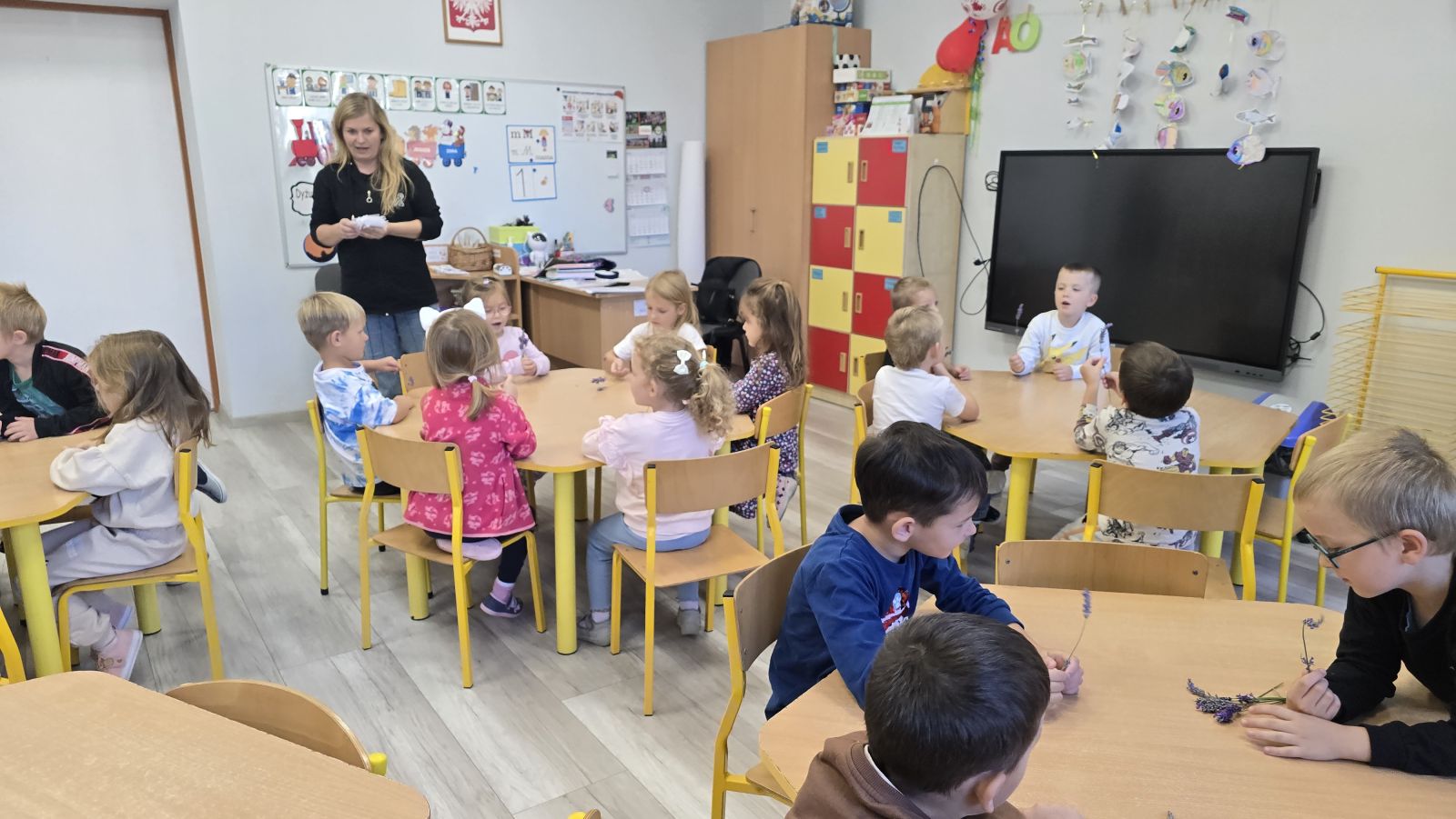 W ramach ogólnopolskiej akcji „Cała Polska czyta dzieciom” naszą grupę ponownie odwiedził wyjątkowy gość – mama jednego z przedszkolaków, która przeczytała dzieciom książkę „Feluś poznaje emocje”. Opowieść o małym Felusiu stała się wspaniałym pretekstem do rozmów o tym, co czujemy w różnych sytuacjach. Dzieci rozpoznawały radość, złość, smutek i zdziwienie. Po części czytelniczej mama przygotowała dla dzieci wyjątkowe zajęcia praktyczne. Każdy mógł własnoręcznie: pokruszyć w dłoniach gałązkę lawendy, by uwolnić jej aromat, a następnie wsypać pachnące kwiatki do materiałowego woreczka. Powstały piękne lawendowe saszetki, które dzieci zabrały do domu – idealne do szuflady, pod poduszkę albo prezent dla bliskiej osoby. To było pełne emocji spotkanie, które pokazało, że czytanie może łączyć się z doświadczeniem świta wszystkimi zmysłami.
