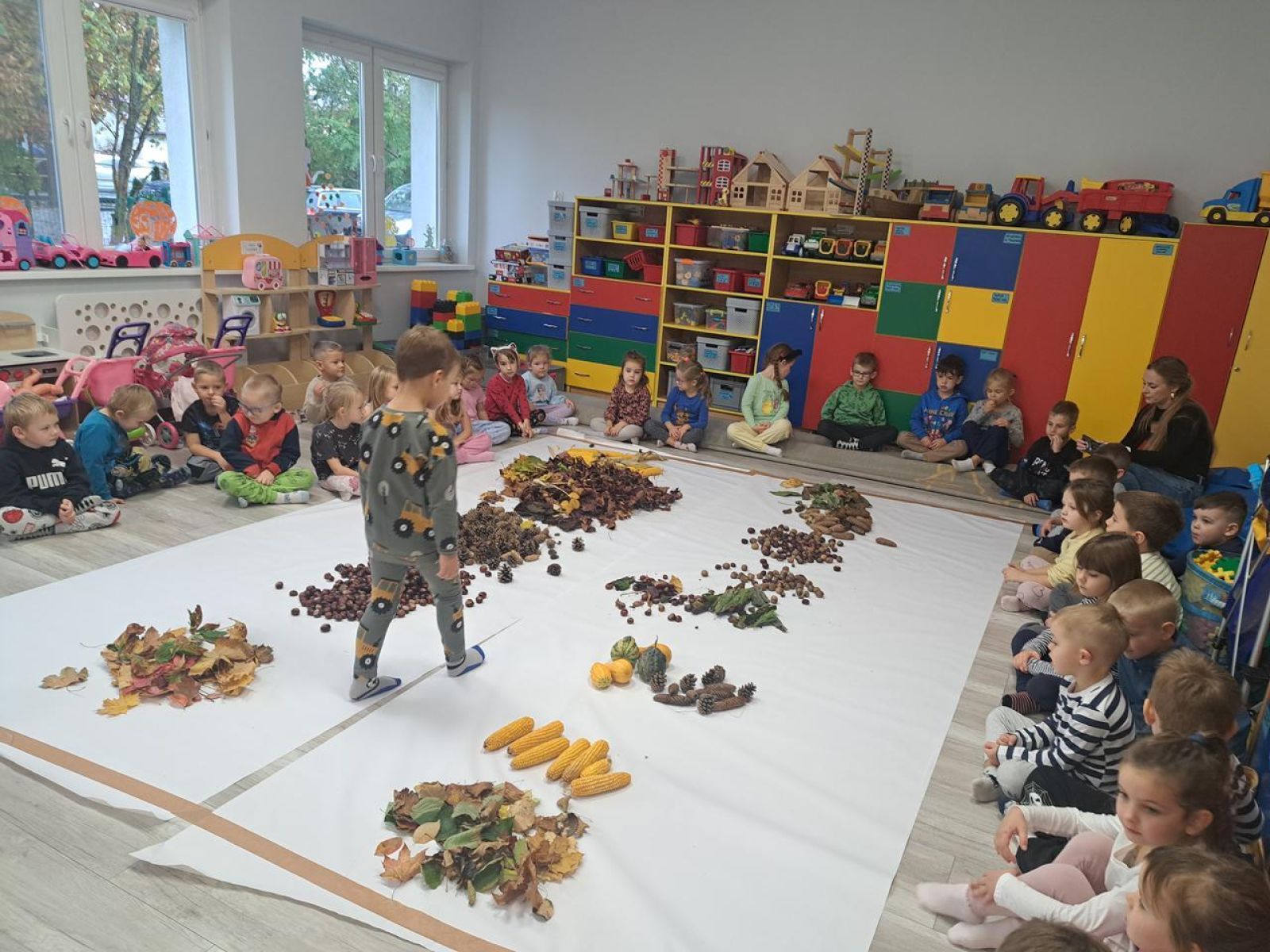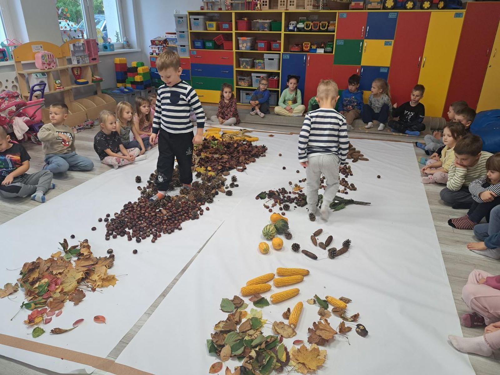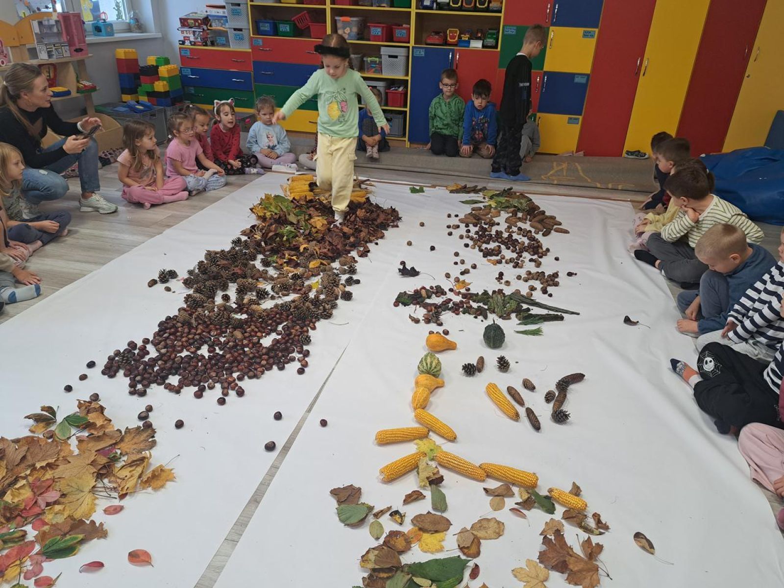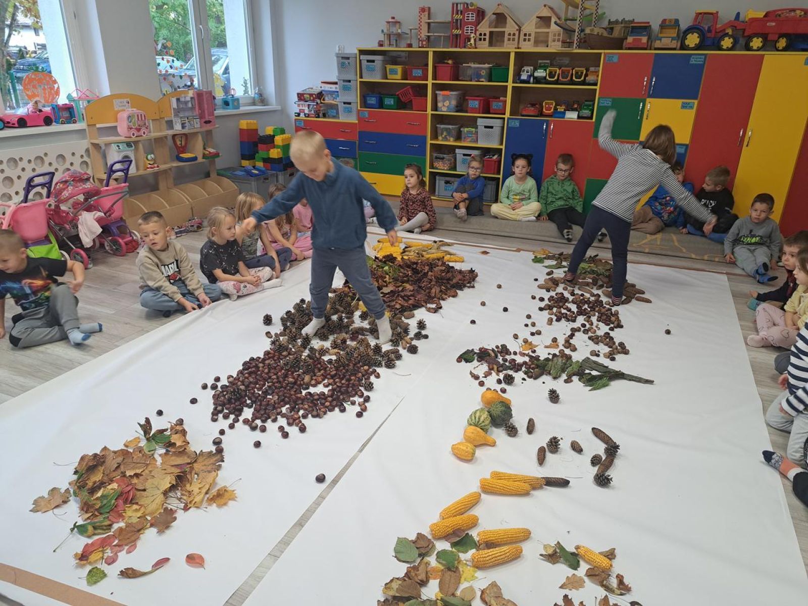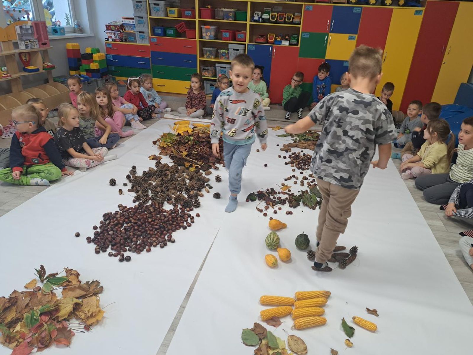 Dzieci z grup Sowy i Stokrotki wzięły udział w realizacji scenariusza innowacji pedagogicznej „Małe Jelonki – Wielki Ruch”, której głównym celem jest rozwijanie sprawności ruchowej oraz wrażliwości sensorycznej przedszkolaków poprzez zabawę i kontakt z naturą. Podczas zajęć dzieci miały okazję przejść po ścieżce sensorycznej z darów jesieni. W przedszkolnej sali  pojawiły się kosze pełne kasztanów, szyszek, żołędzi, kolorowych liści, mchu i kory drzew. Przedszkolaki z wielką ciekawością i radością odkrywały różnorodne faktury i zapachy jesiennych skarbów, stymulując zmysł dotyku oraz równowagę.