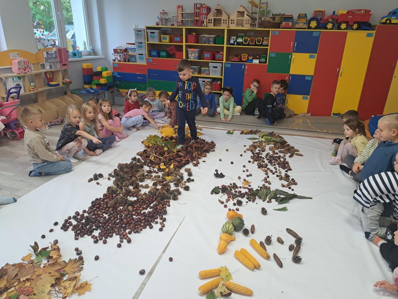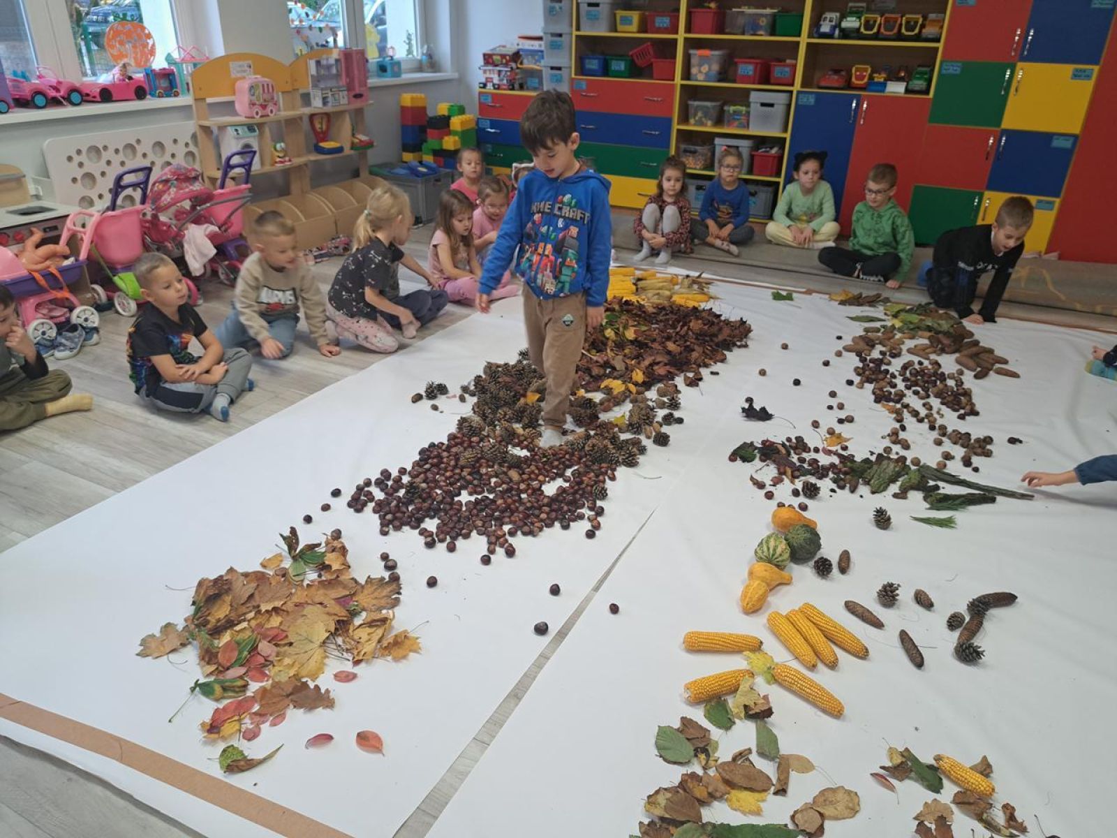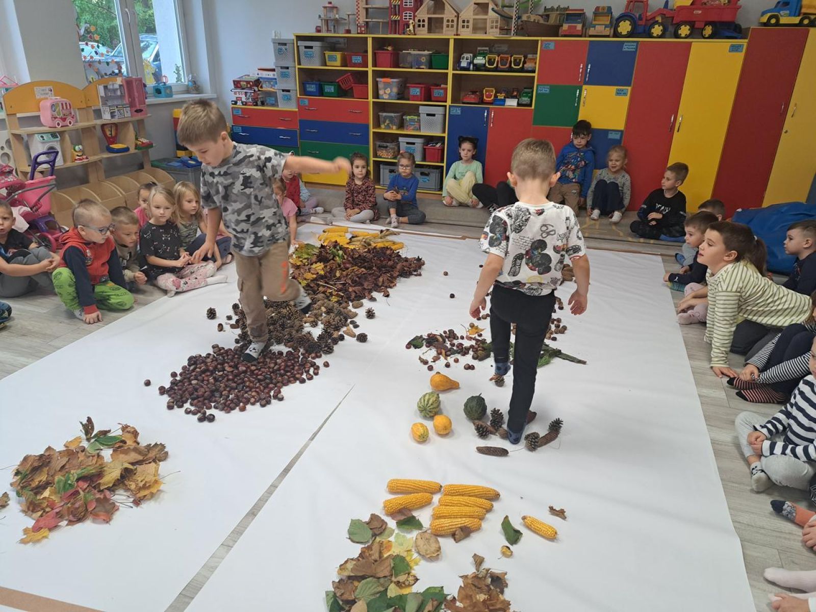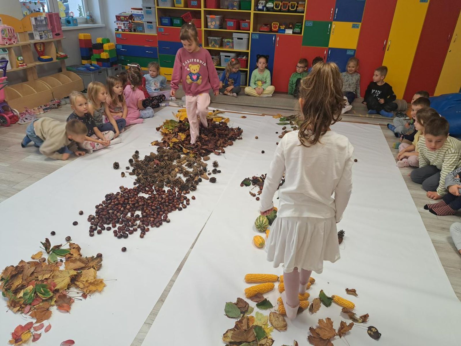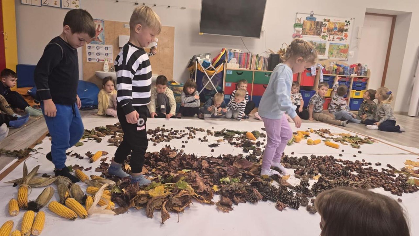 Dzieci z grup Sowy i Stokrotki wzięły udział w realizacji scenariusza innowacji pedagogicznej „Małe Jelonki – Wielki Ruch”, której głównym celem jest rozwijanie sprawności ruchowej oraz wrażliwości sensorycznej przedszkolaków poprzez zabawę i kontakt z naturą. Podczas zajęć dzieci miały okazję przejść po ścieżce sensorycznej z darów jesieni. W przedszkolnej sali  pojawiły się kosze pełne kasztanów, szyszek, żołędzi, kolorowych liści, mchu i kory drzew. Przedszkolaki z wielką ciekawością i radością odkrywały różnorodne faktury i zapachy jesiennych skarbów, stymulując zmysł dotyku oraz równowagę.