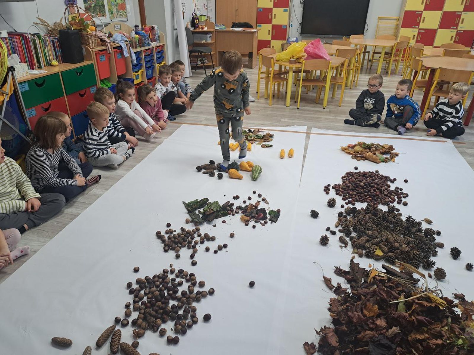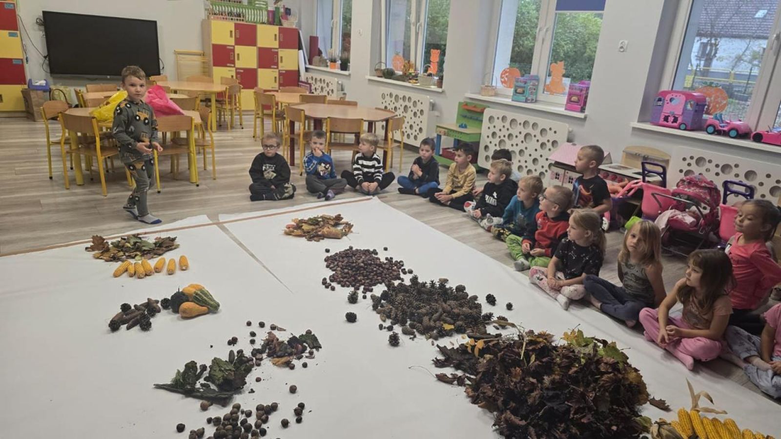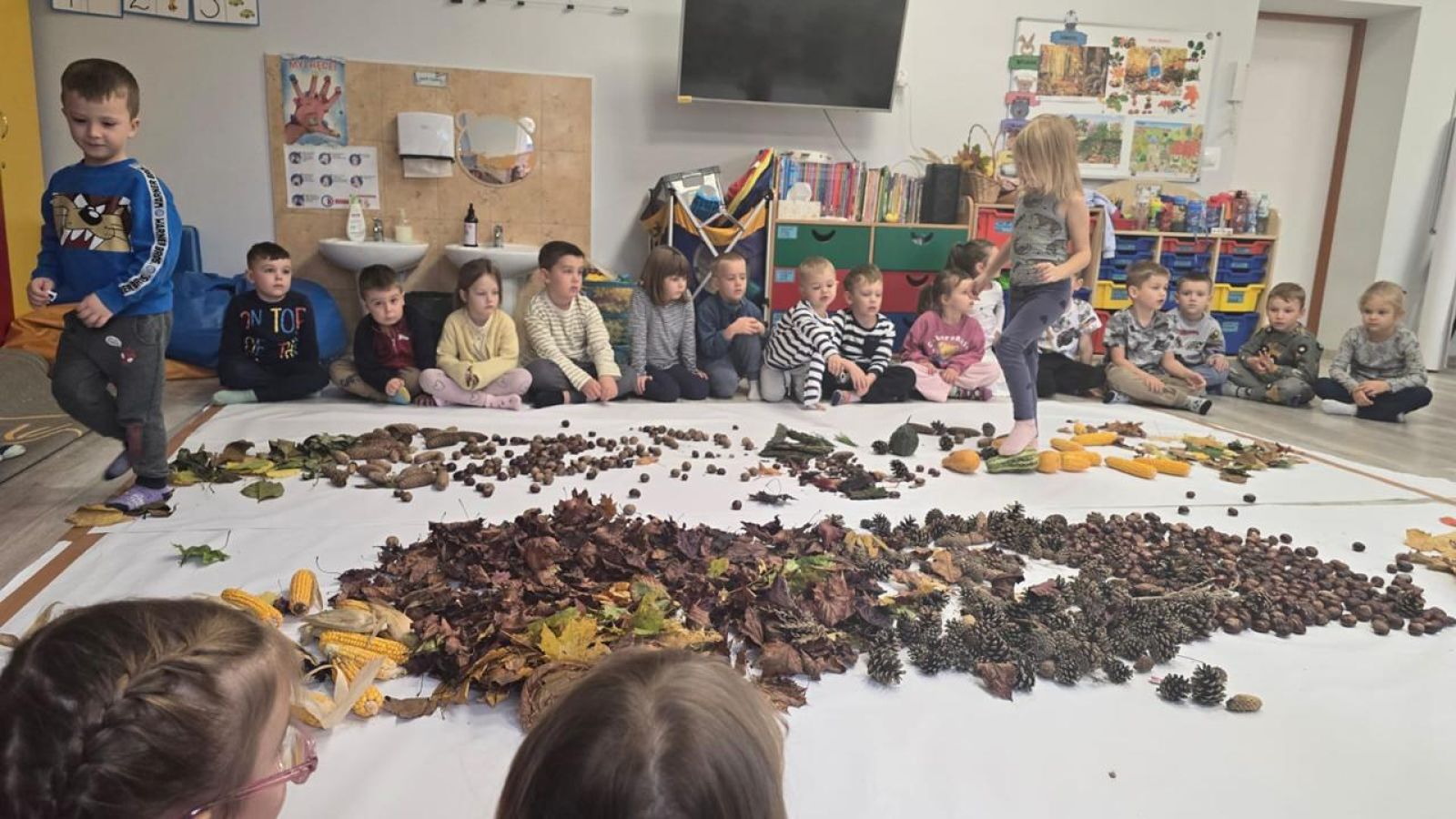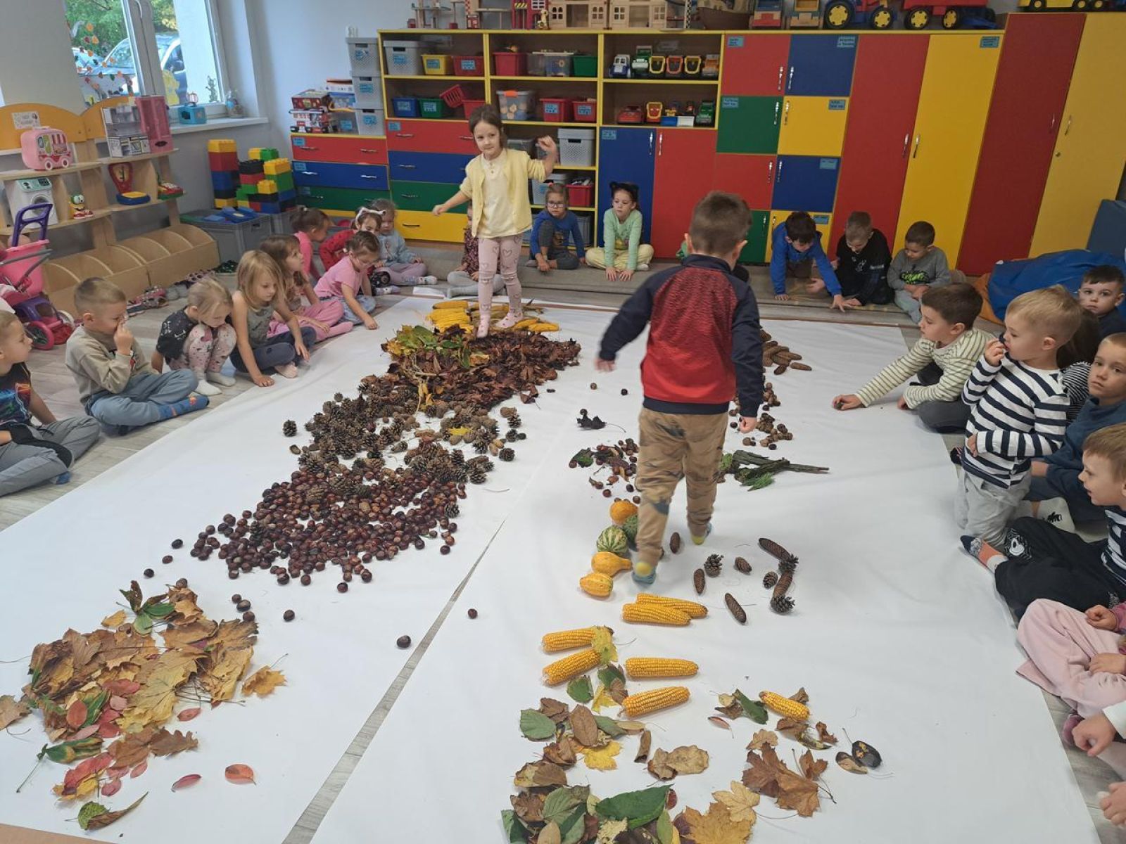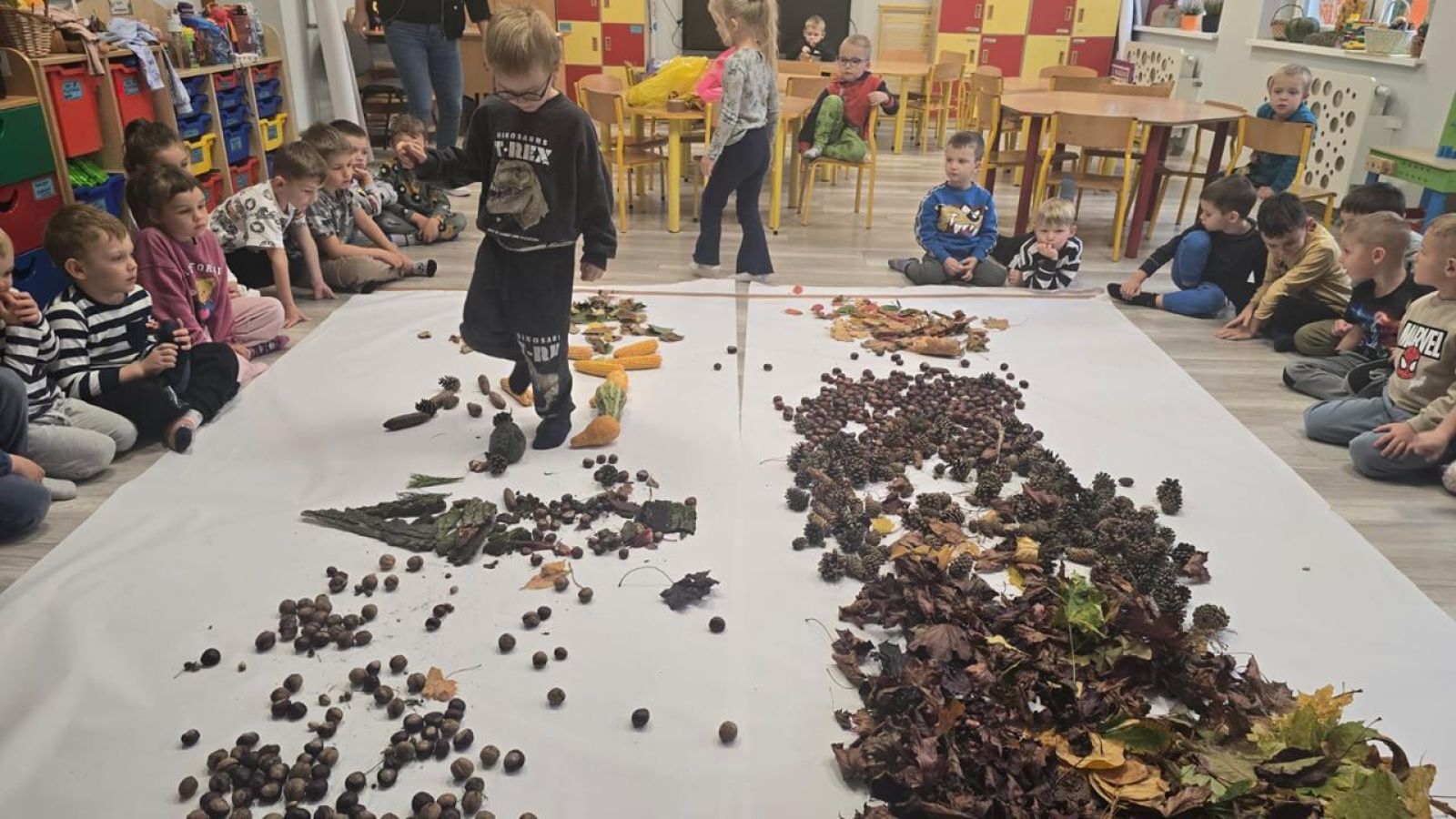 Dzieci z grup Sowy i Stokrotki wzięły udział w realizacji scenariusza innowacji pedagogicznej „Małe Jelonki – Wielki Ruch”, której głównym celem jest rozwijanie sprawności ruchowej oraz wrażliwości sensorycznej przedszkolaków poprzez zabawę i kontakt z naturą. Podczas zajęć dzieci miały okazję przejść po ścieżce sensorycznej z darów jesieni. W przedszkolnej sali  pojawiły się kosze pełne kasztanów, szyszek, żołędzi, kolorowych liści, mchu i kory drzew. Przedszkolaki z wielką ciekawością i radością odkrywały różnorodne faktury i zapachy jesiennych skarbów, stymulując zmysł dotyku oraz równowagę.