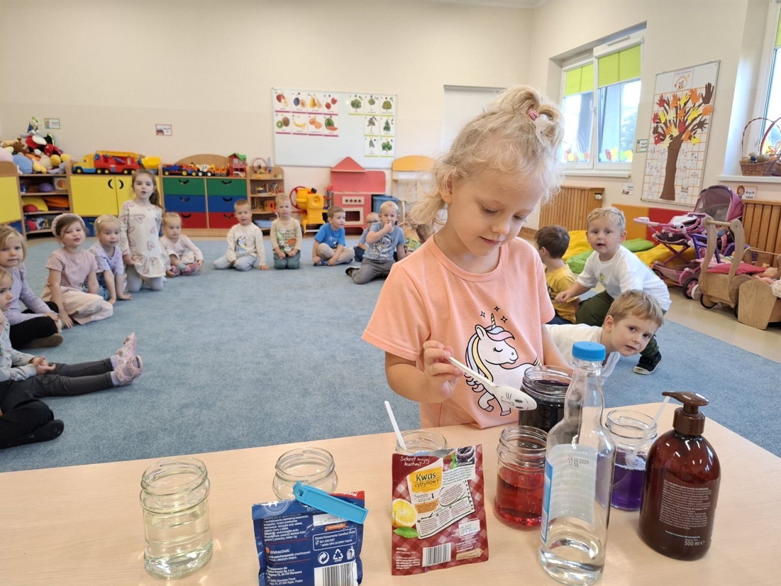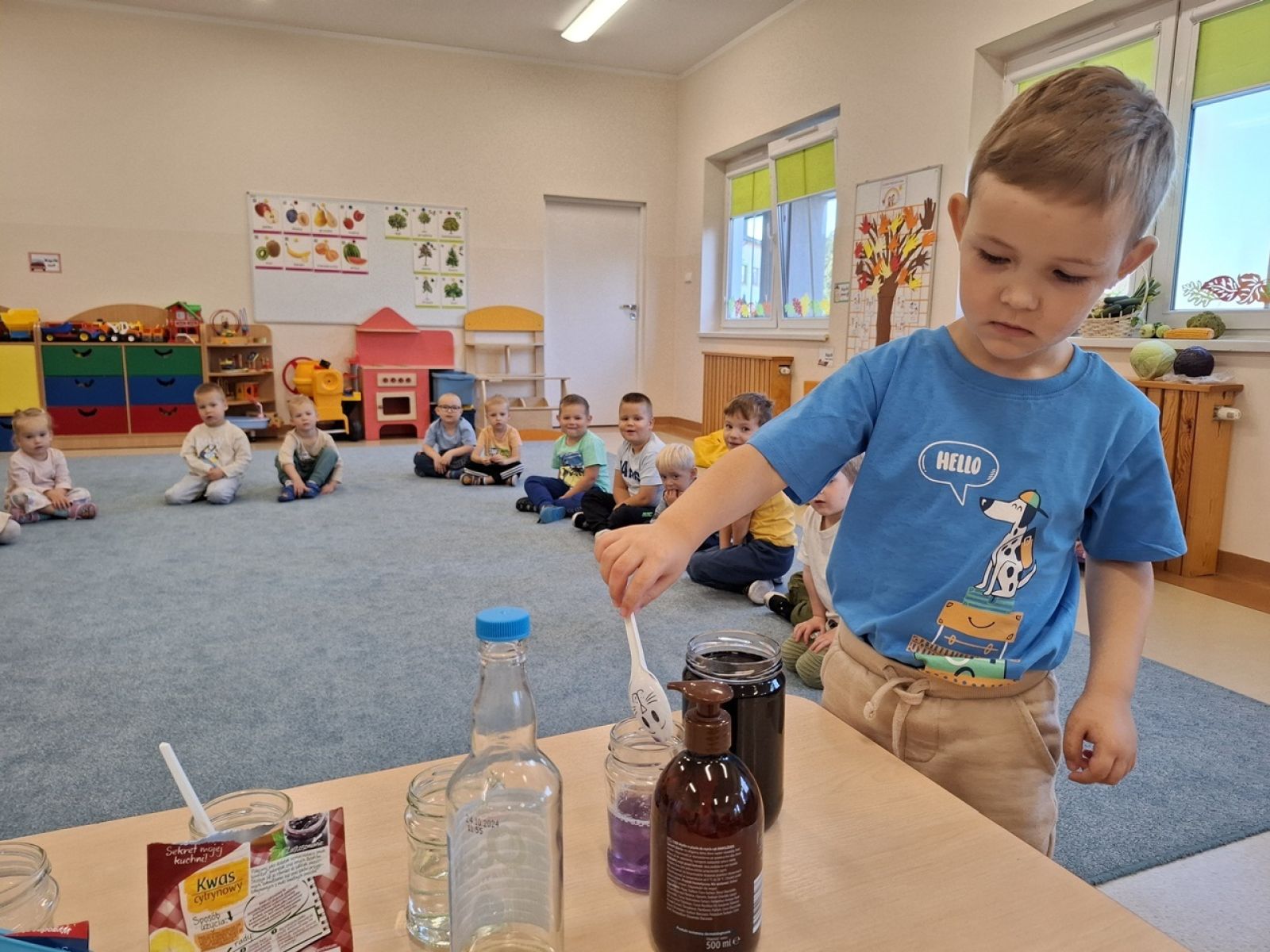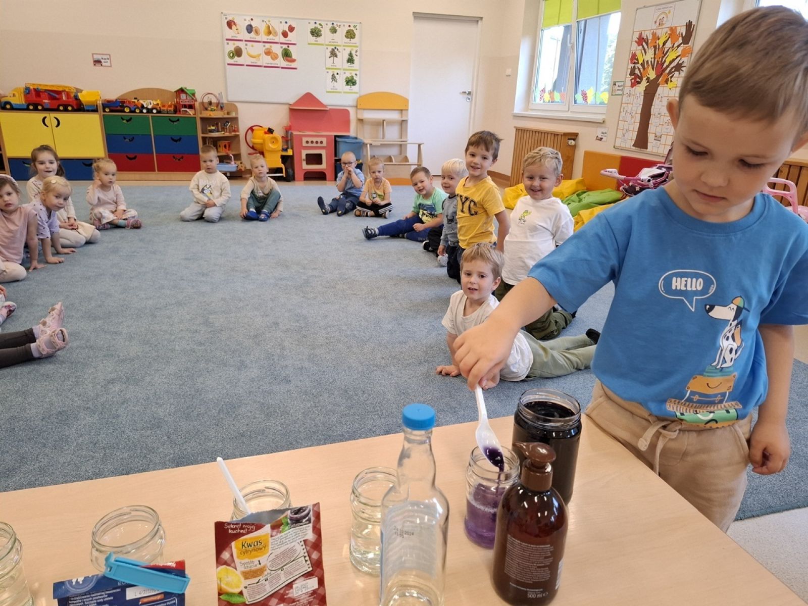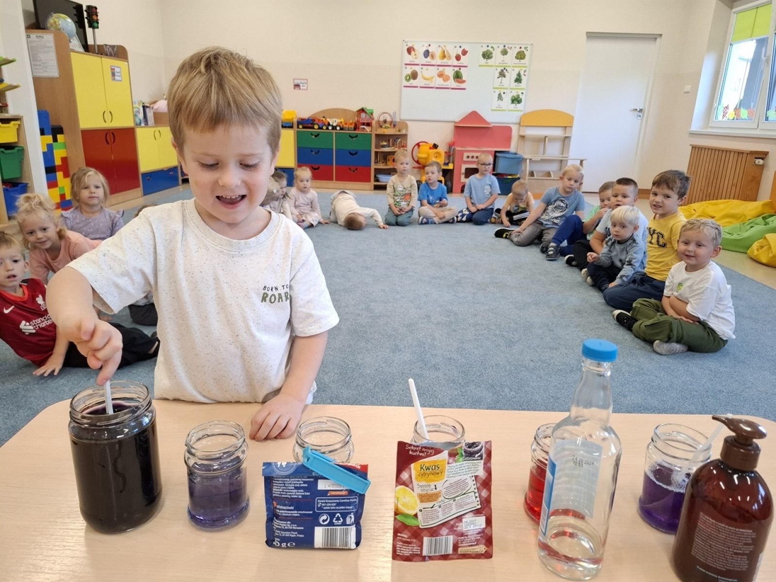 Realizując tematykę tygodnia , dzieci różnymi zmysłami poznawały owoce i warzywa. Badaliśmy ich cechy wykorzystując nasz wzrok, słuch, smak i dotyk. Bawiliśmy się matematycznie porównując wielkości, wagi czy kolory. Świetnie nam szło klasyfikowanie ze względu na różne cechy czy układanie rytmów. Kto by pomyślał, że wśród tej żywieniowej grupy jest „magiczny” sok z czerwonej kapusty, który sprowokował nas do eksperymentowania. Dzieci chętnie przystąpiły do działania i mieszały sok z różnymi cieczami kwasowymi i zasadowymi. Jakież było nasze zdziwienie, gdy sok z czerwonej kapusty o dziwnym ciemnym, trochę czarnym trochę fioletowym kolorze, po zmieszaniu ukazał inne barwy. To jest na pewno „magiczny” sok z czerwonej kapusty.