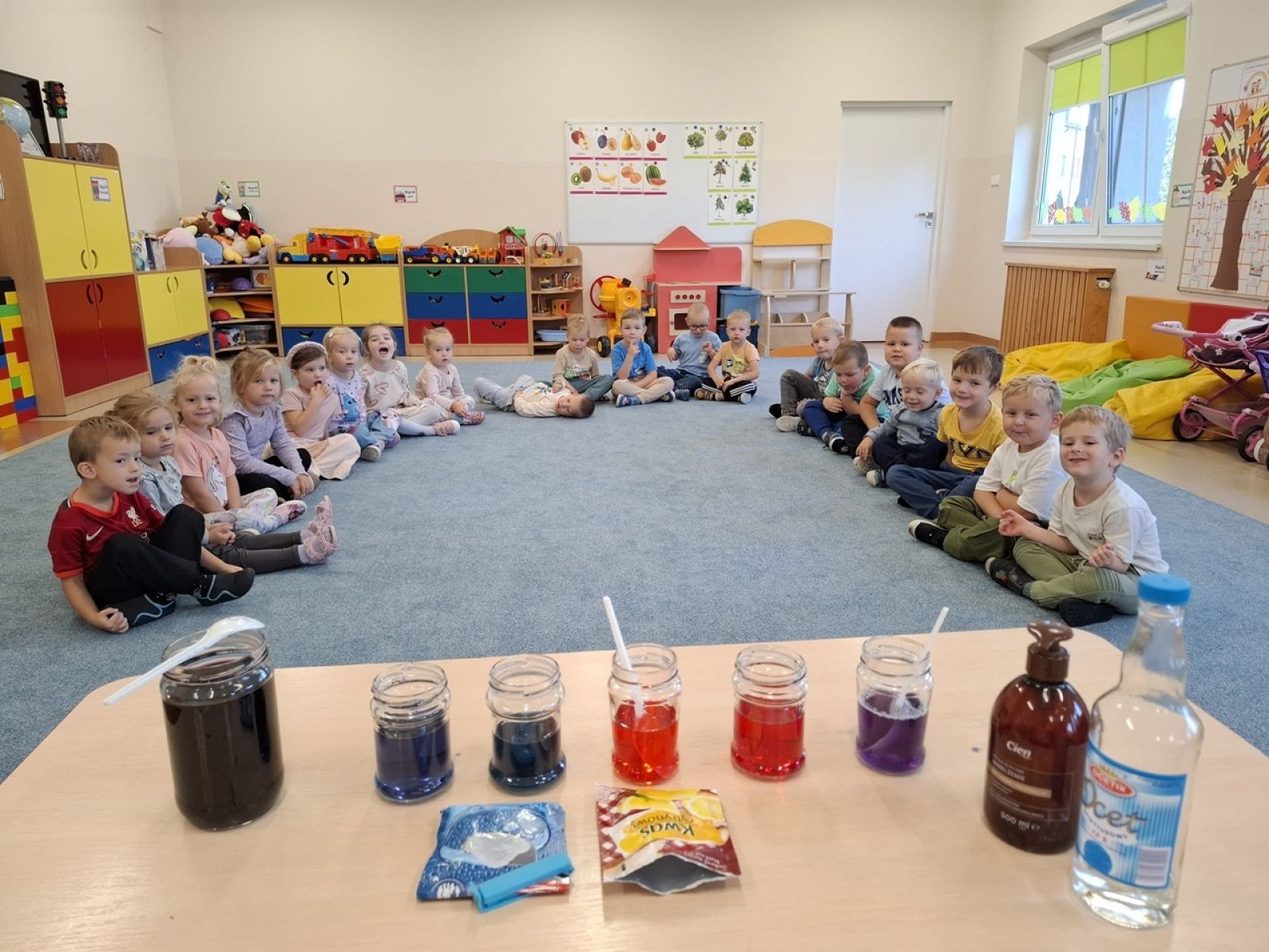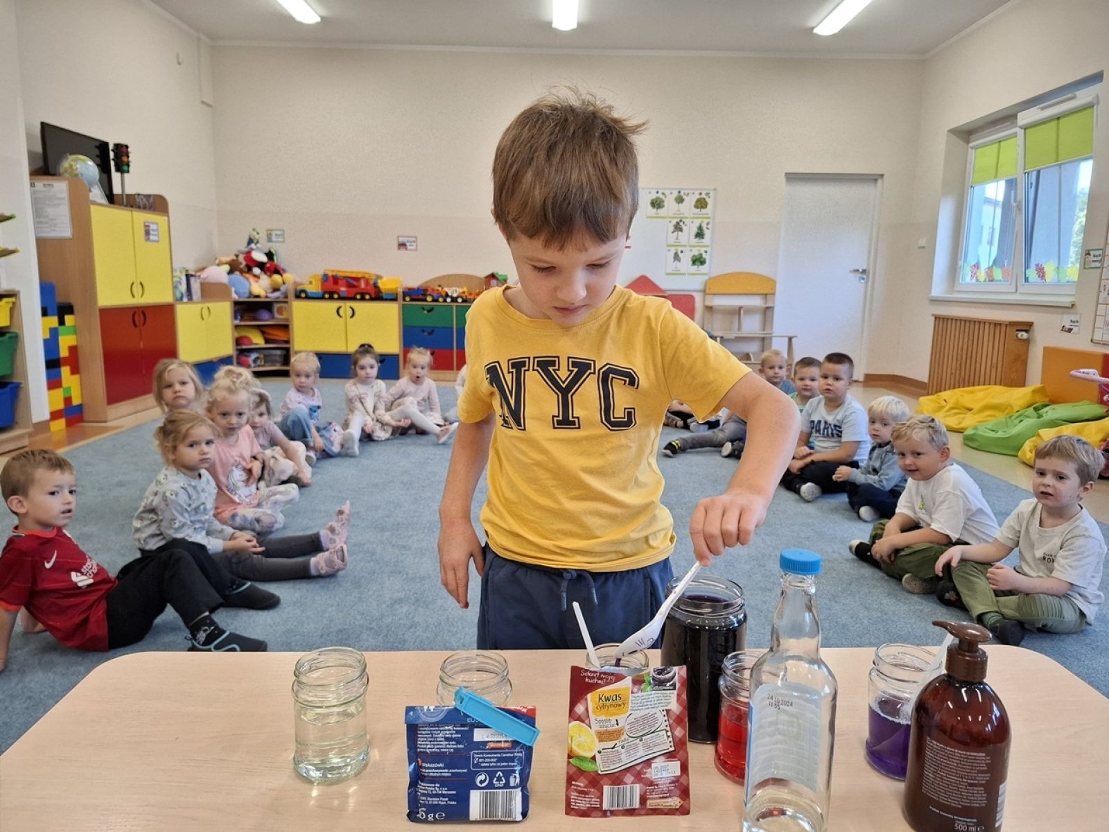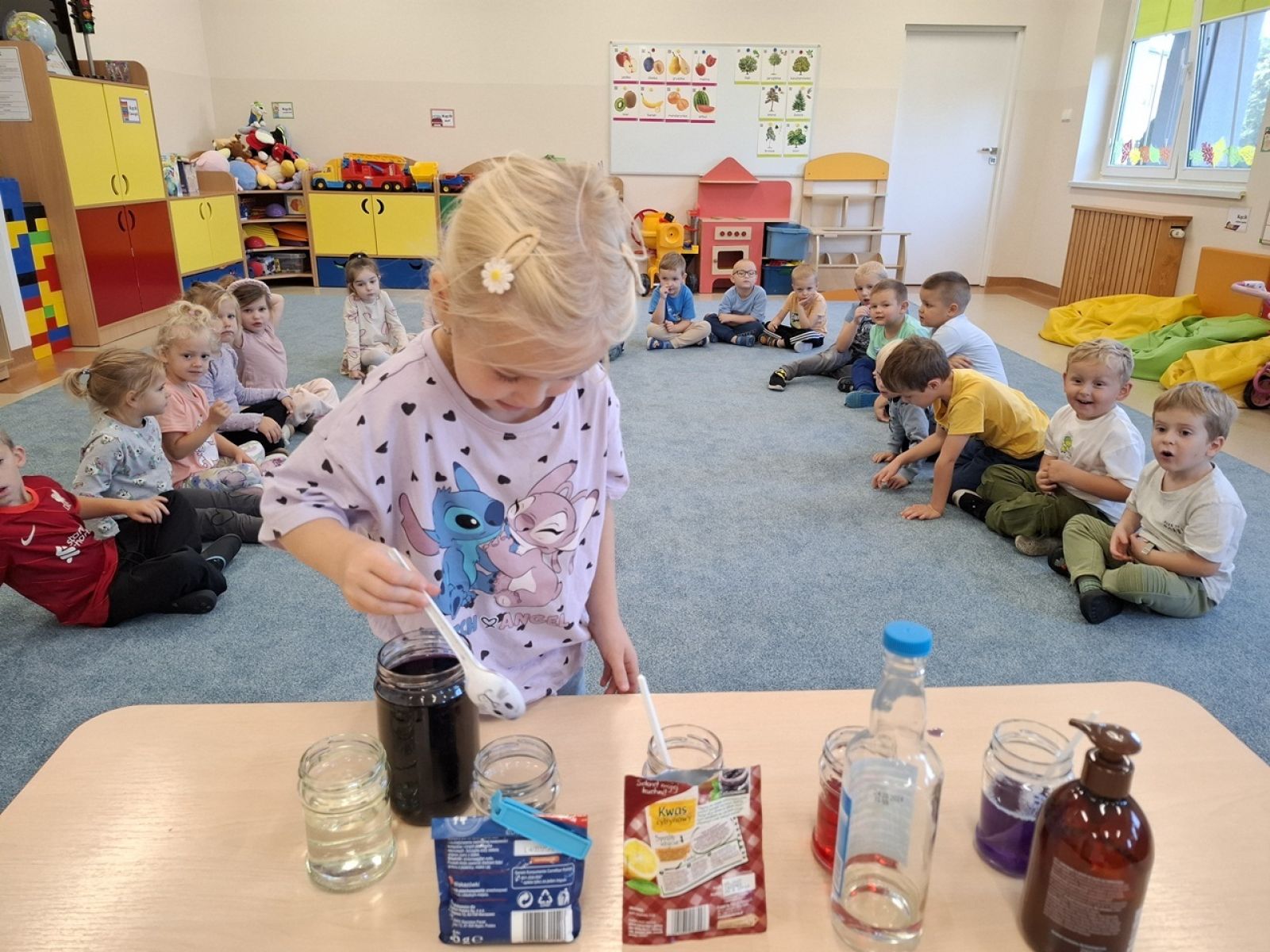 Realizując tematykę tygodnia , dzieci różnymi zmysłami poznawały owoce i warzywa. Badaliśmy ich cechy wykorzystując nasz wzrok, słuch, smak i dotyk. Bawiliśmy się matematycznie porównując wielkości, wagi czy kolory. Świetnie nam szło klasyfikowanie ze względu na różne cechy czy układanie rytmów. Kto by pomyślał, że wśród tej żywieniowej grupy jest „magiczny” sok z czerwonej kapusty, który sprowokował nas do eksperymentowania. Dzieci chętnie przystąpiły do działania i mieszały sok z różnymi cieczami kwasowymi i zasadowymi. Jakież było nasze zdziwienie, gdy sok z czerwonej kapusty o dziwnym ciemnym, trochę czarnym trochę fioletowym kolorze, po zmieszaniu ukazał inne barwy. To jest na pewno „magiczny” sok z czerwonej kapusty.