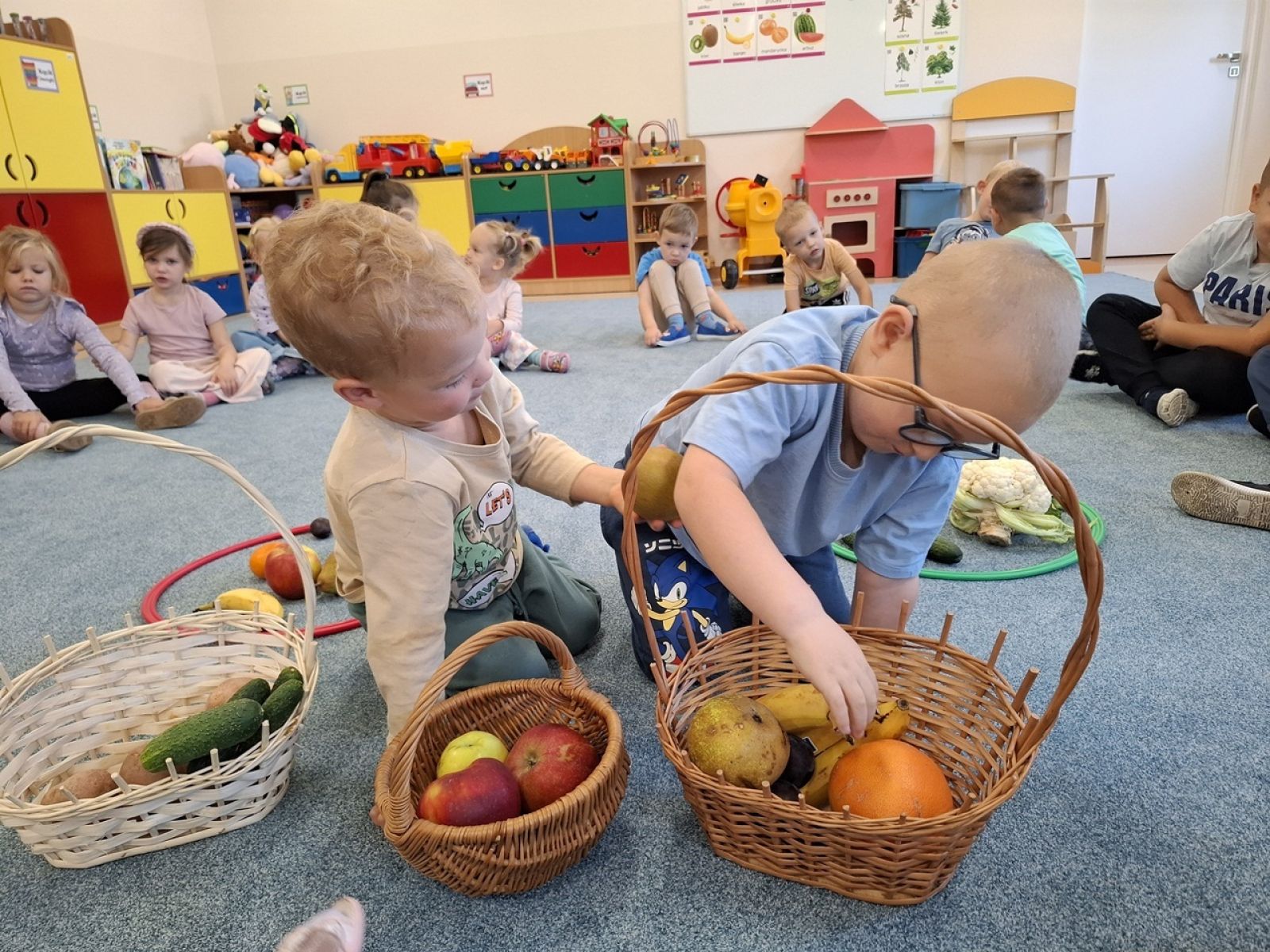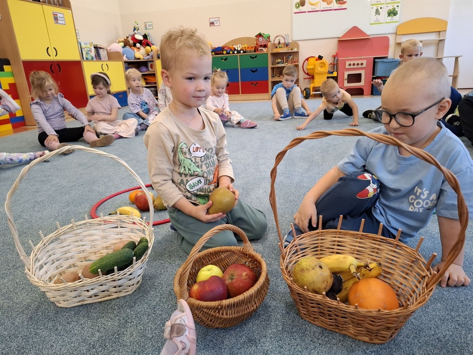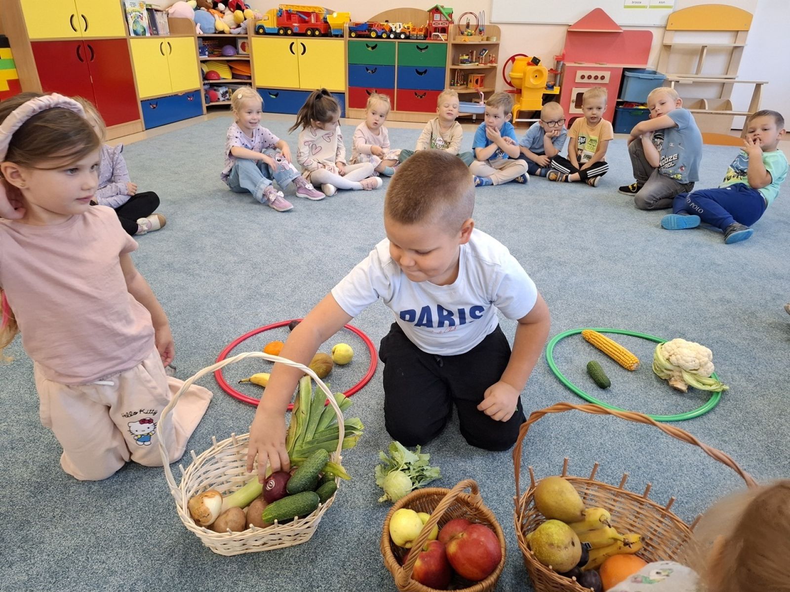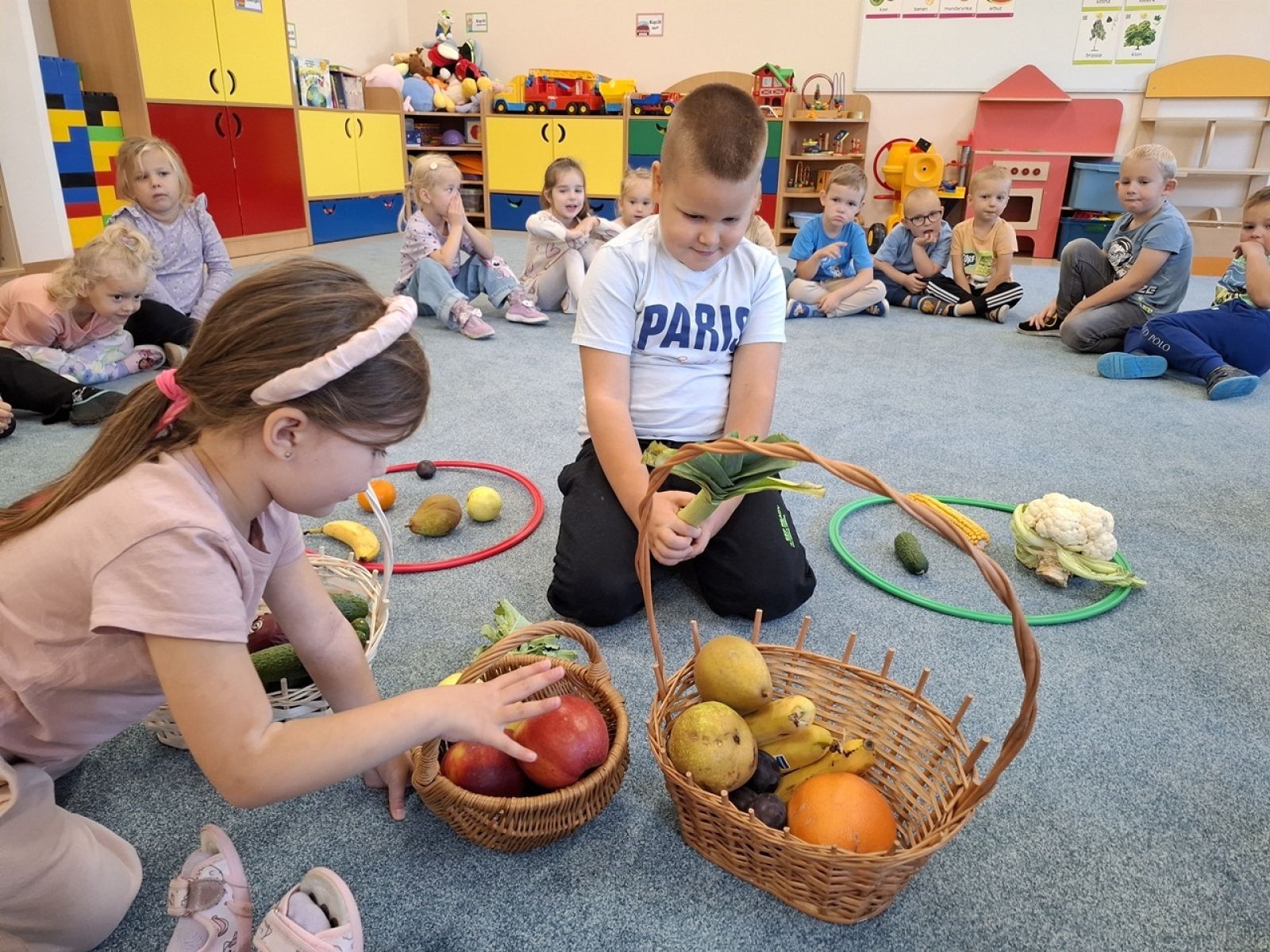 Realizując tematykę tygodnia , dzieci różnymi zmysłami poznawały owoce i warzywa. Badaliśmy ich cechy wykorzystując nasz wzrok, słuch, smak i dotyk. Bawiliśmy się matematycznie porównując wielkości, wagi czy kolory. Świetnie nam szło klasyfikowanie ze względu na różne cechy czy układanie rytmów. Kto by pomyślał, że wśród tej żywieniowej grupy jest „magiczny” sok z czerwonej kapusty, który sprowokował nas do eksperymentowania. Dzieci chętnie przystąpiły do działania i mieszały sok z różnymi cieczami kwasowymi i zasadowymi. Jakież było nasze zdziwienie, gdy sok z czerwonej kapusty o dziwnym ciemnym, trochę czarnym trochę fioletowym kolorze, po zmieszaniu ukazał inne barwy. To jest na pewno „magiczny” sok z czerwonej kapusty.