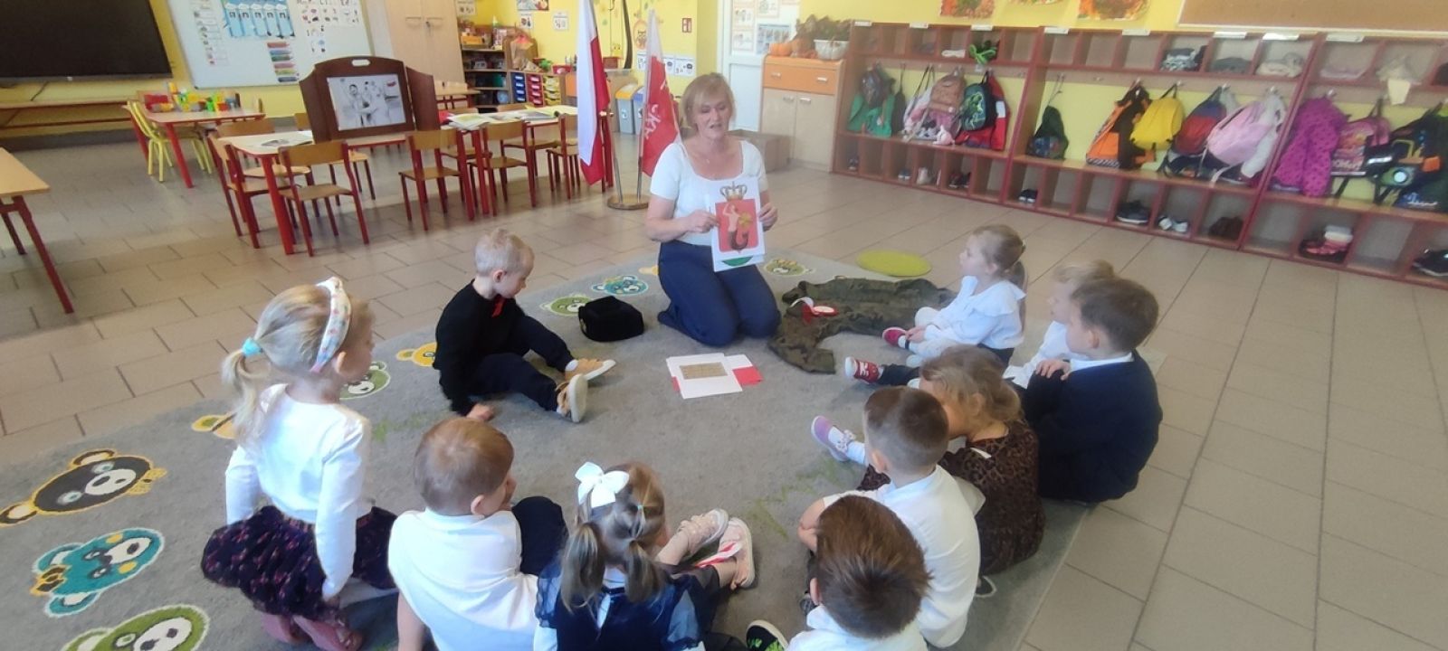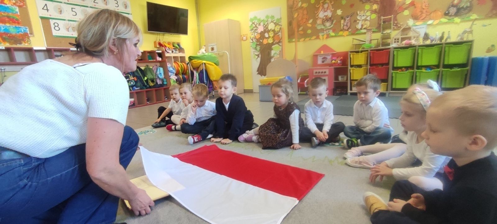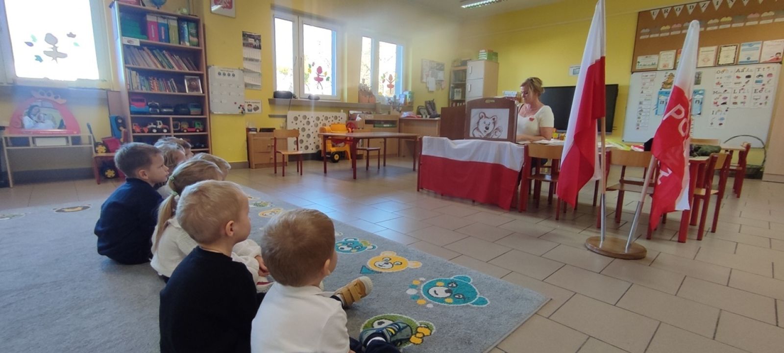 Pani Beata w prostych słowach wyjaśniła znaczenie barw i symboli narodowych, podkreślając, jak ważne jest ich szanowanie. Dzieci z dużym zainteresowaniem oglądały godło, konstytucję oraz flagę.