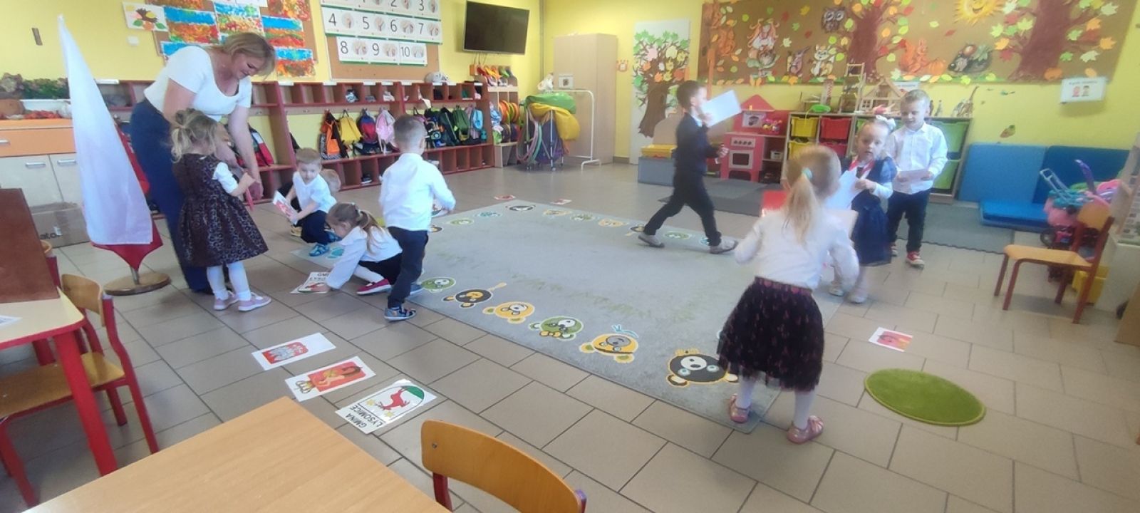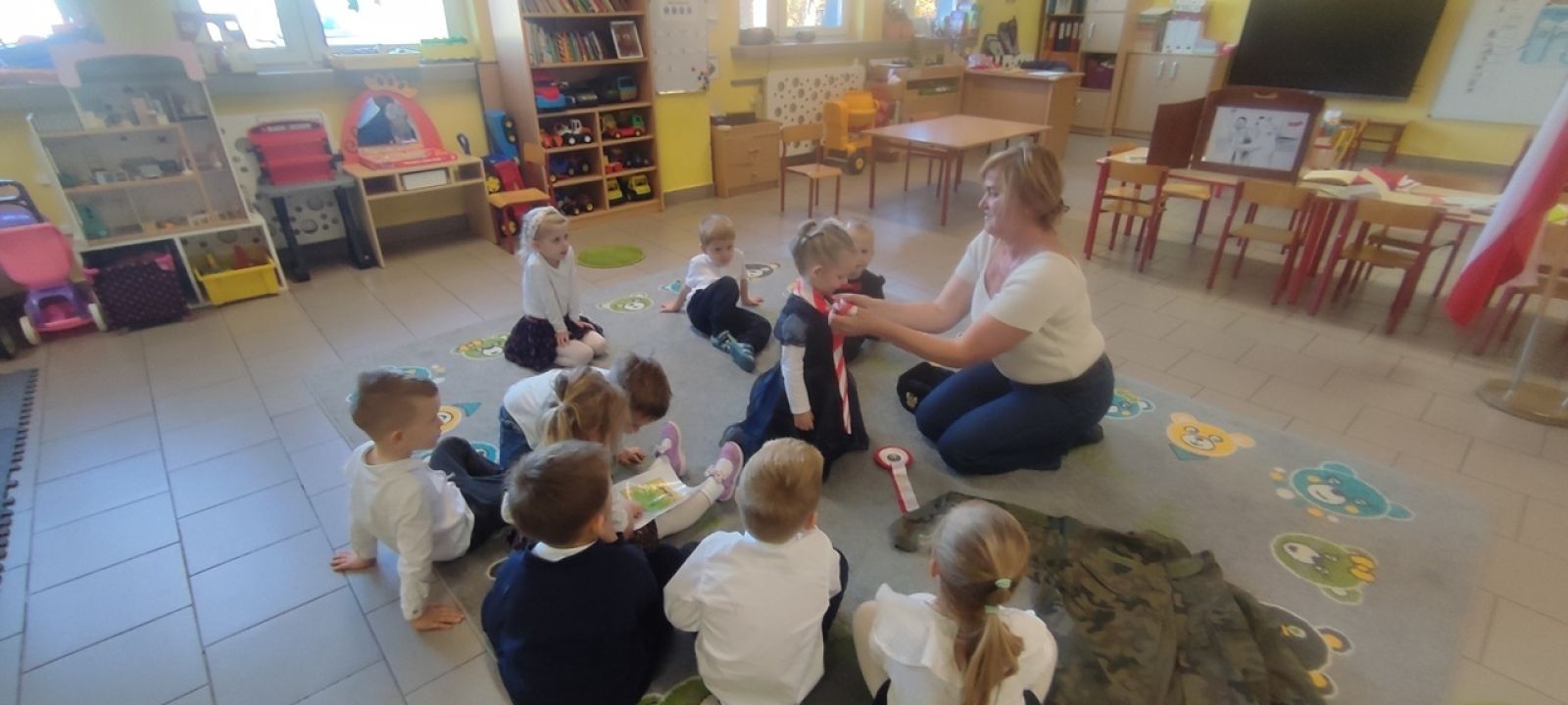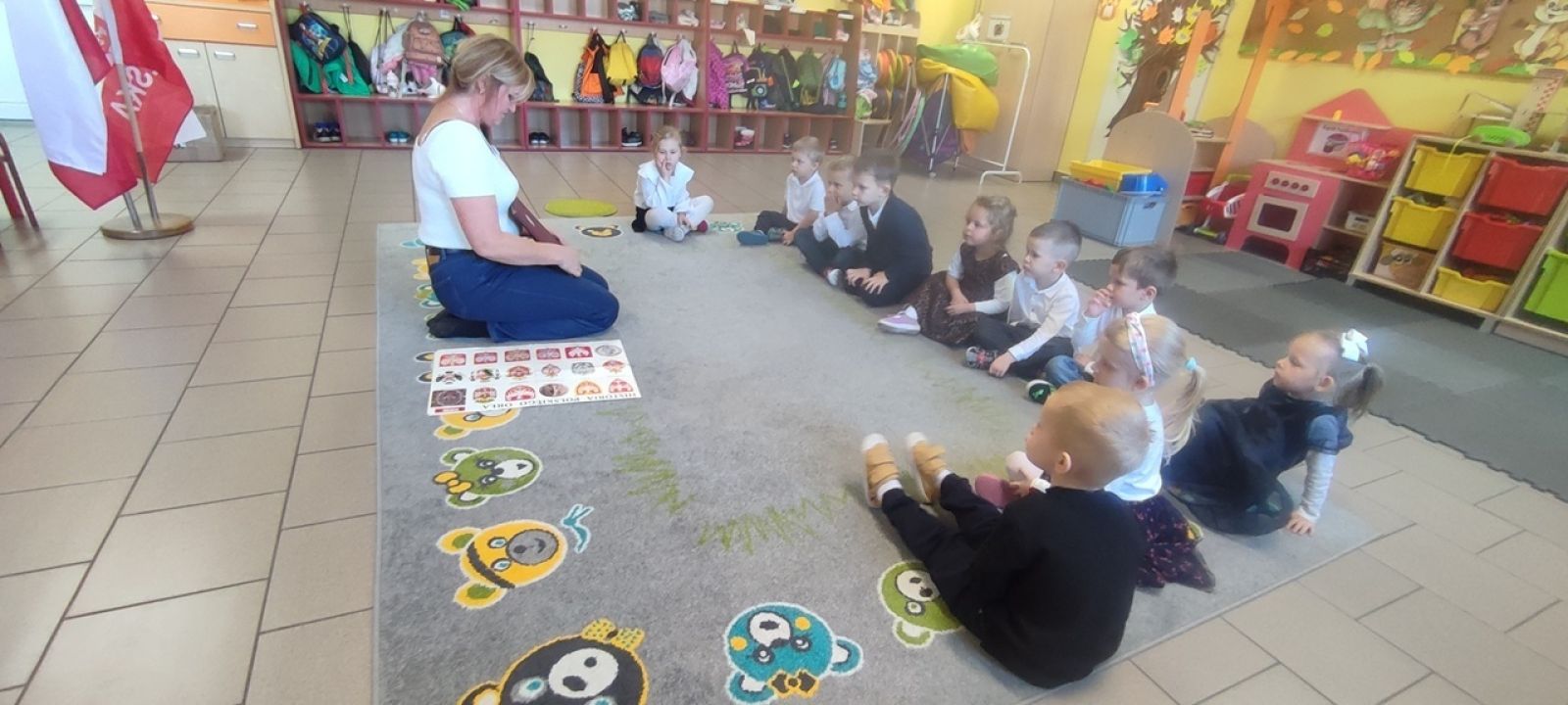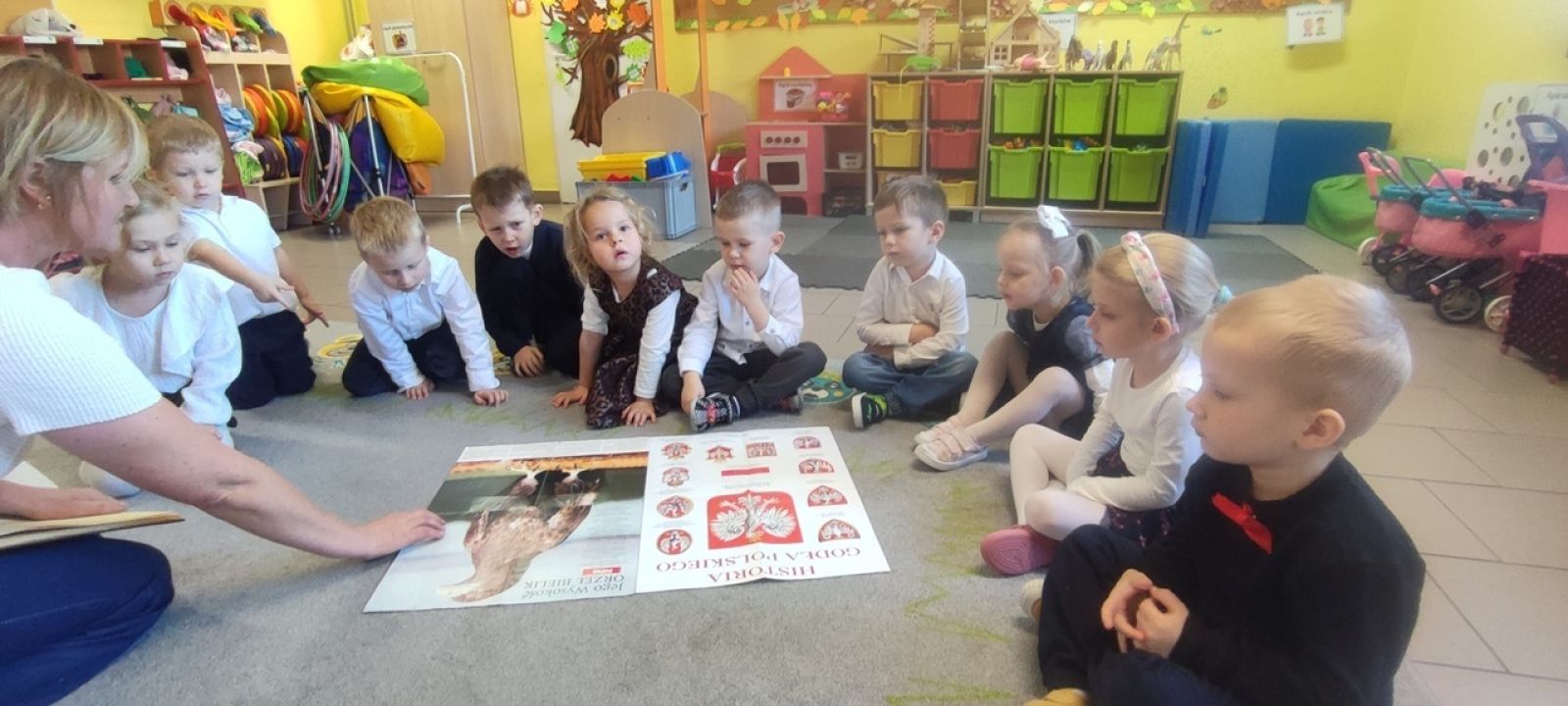 Pani Beata w prostych słowach wyjaśniła znaczenie barw i symboli narodowych, podkreślając, jak ważne jest ich szanowanie. Dzieci z dużym zainteresowaniem oglądały godło, konstytucję oraz flagę.