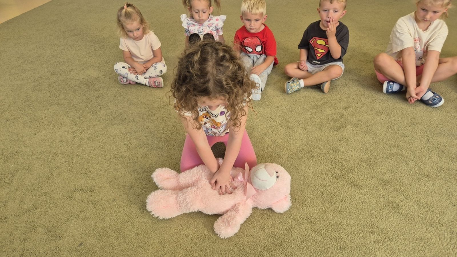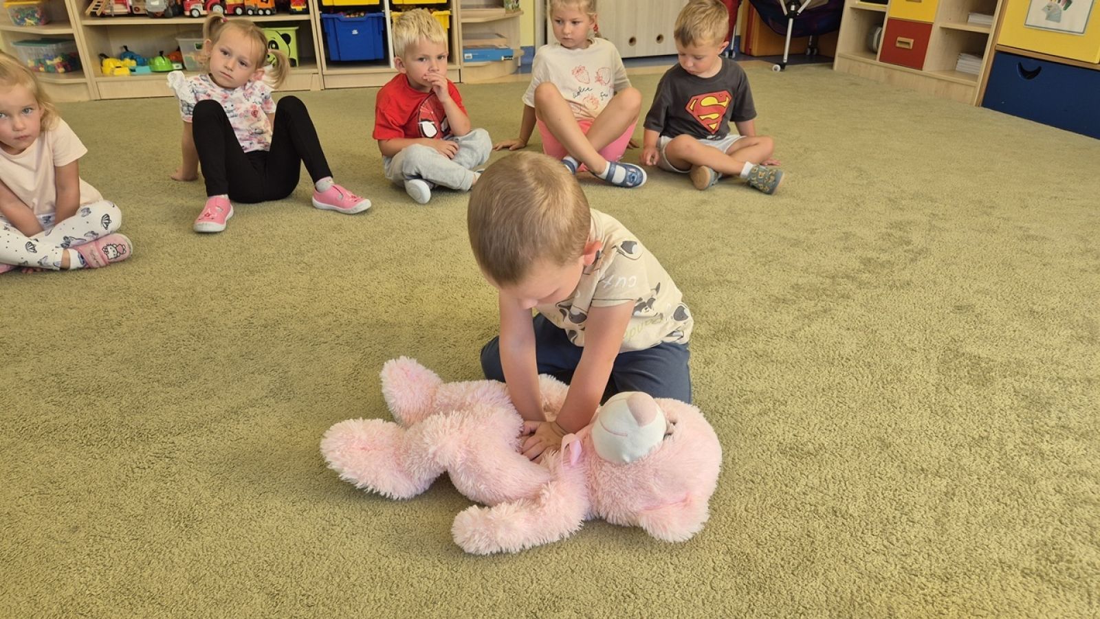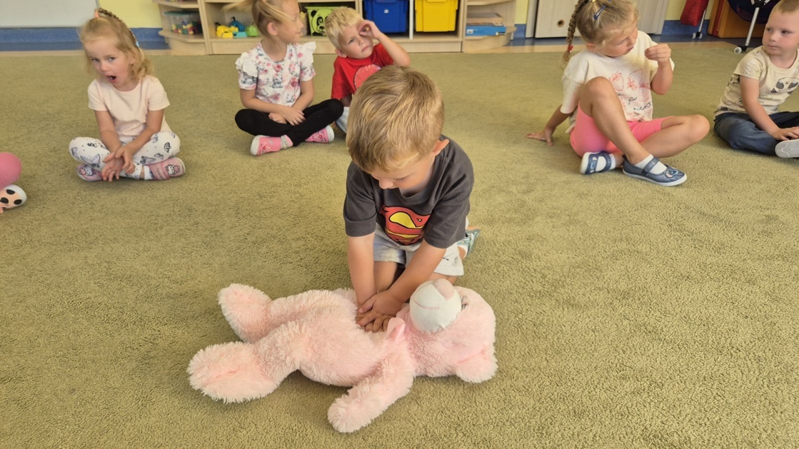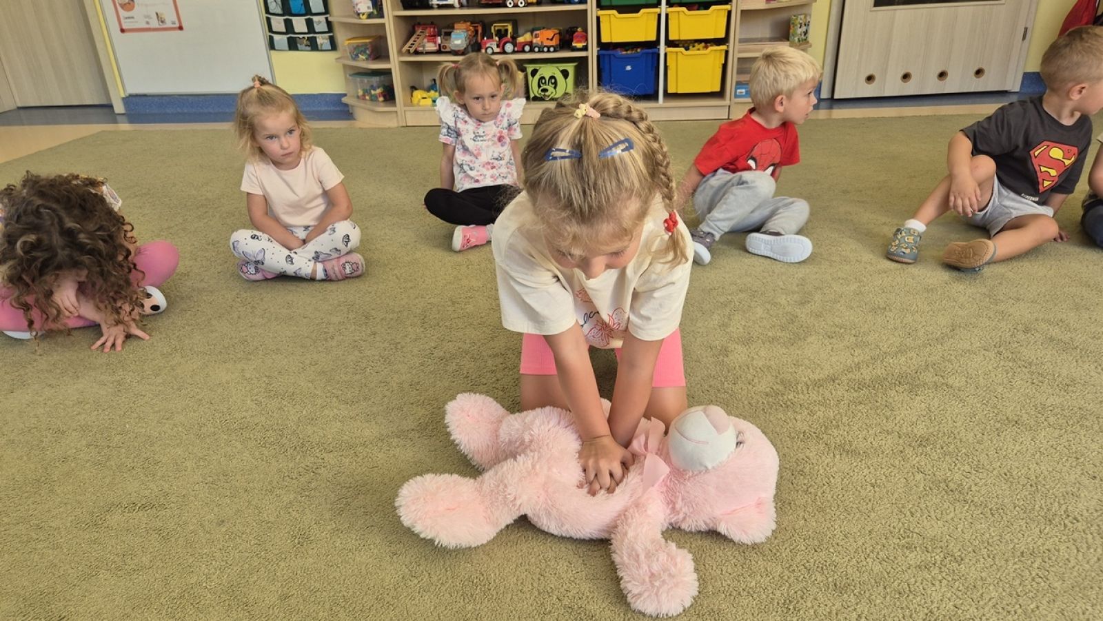 Po lekturze książki dzieci z ogromnym zaangażowaniem przystąpiły do udzielania pierwszej pomocy przedszkolnemu misiowi. Wysłuchały też krótkiego pokazu dzięki któremu dowiedziały się, jak prawidłowo wezwać pomoc, dzwoniąc pod numer 112.